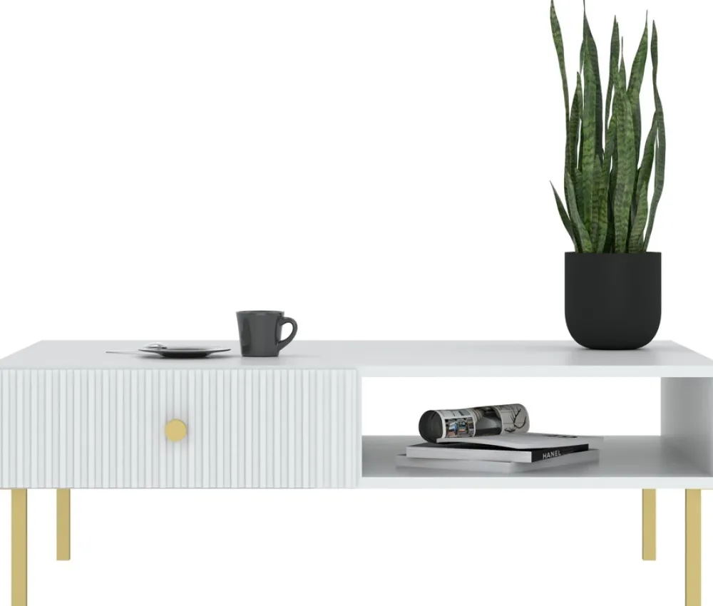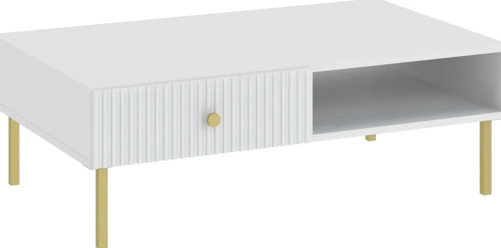- Stolik kawowy VALTEO 102 cm w białym kolorze ze złotymi detalami to elegancki mebel do salonu lub sypialni. Posiada szufladę i półkę, które ułatwiają przechowywanie. Idealny do wnętrz glamour i nowoczesnych aranżacji.