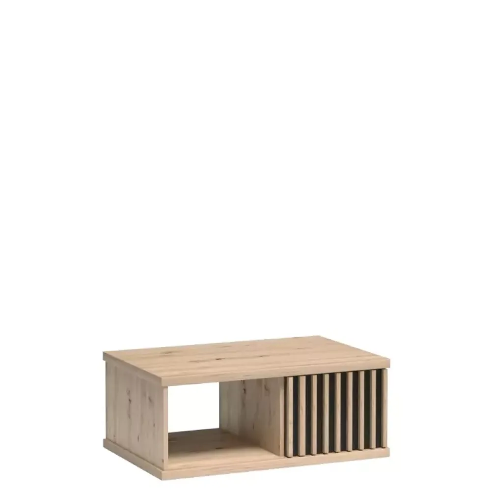 Stolik kawowy CALIS to propozycja, dzięki której zyskasz miejsce na położenie kawy bądź herbaty podczas wspólnego siedzenia na kanapie przed ulubionym filmem. Stolik posiada lamele u frontu oraz dekoracyjne półki z tyłu, na których możesz umieścić rozmaite dekory.