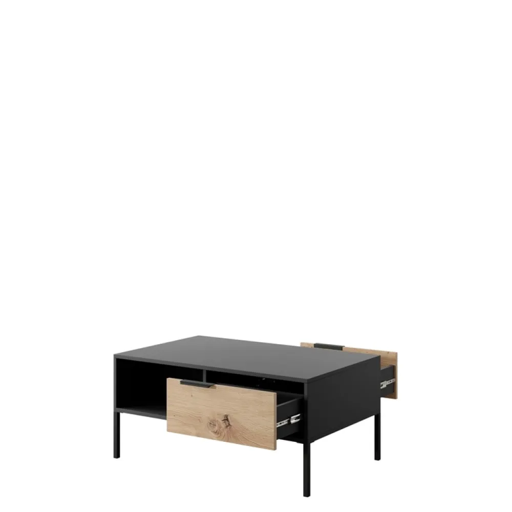 Stolik kawowy został wykonany z wysokiej jakości materiałów, dzięki czemu zachwyci Cię trwałością i wytrzymałością. Dwie szuflady, które otwierają się w przeciwnych kierunkach – jedna do przodu, a druga do tyłu – zostały wykończone kolorystycznie w pięknym odcieniu dębu artisan. Zapewniają praktyczne i szybkie przechowywanie Twoich ulubionych przedmiotów.