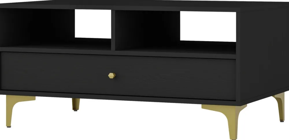 - Stolik kawowy z szufladą TOKEN to propozycja na wyposażenie nowoczesnego wnętrza w eleganckim stylu. Stolik posiada szufladę u dołu, oraz dwie półki. Nogi oraz uchwyty zostały wykonane z metalu w złotym kolorze. Korpus i front wykonano z płyty laminowanej