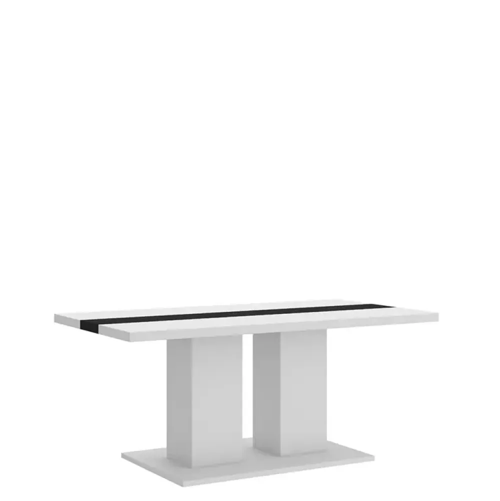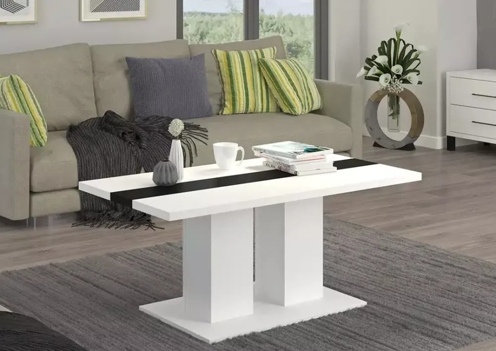 - Nowoczesny stolik kawowy w kolorze białym z czarną wstawką w blacie. Ława Basti ma blat w kształcie prostokąta o wymiarach 110×60.