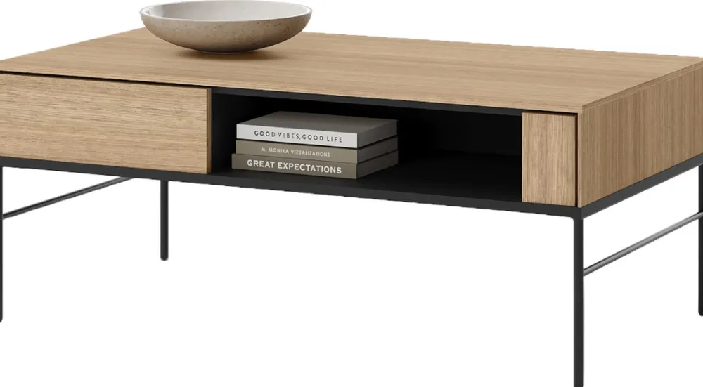 - Stolik kawowy VISSO posiada blat o wymiarze 110×60 cm, pod którym znajduje się półka na pilot lub inne akcesoria. Nóżki stolika zostały wykonane z metalu w czarnym kolorze. Stolik wykonany z płyty laminowanej 16 mm w kolorze dąb linearny.