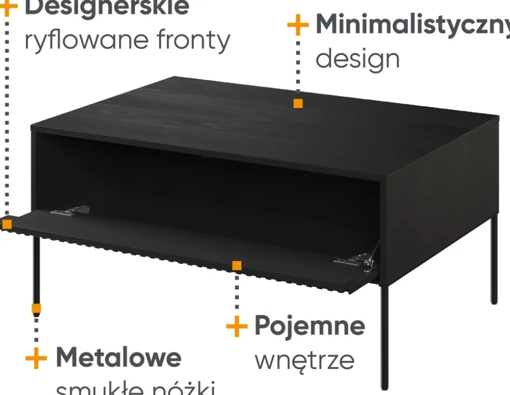 Jego front wykonany jest z 18 mm płyty MDF, na której uwagę przyciąga ryflowany wzór frezowany w prostym kształcie. To wyrafinowane zdobienie na tle czerni dodaje meblowi głębi i wyrazistości. Solidny korpus stolika, stworzony z 16 mm płyty laminowanej, gwarantuje trwałość i stabilność, jednocześnie podkreślając nowoczesny styl.