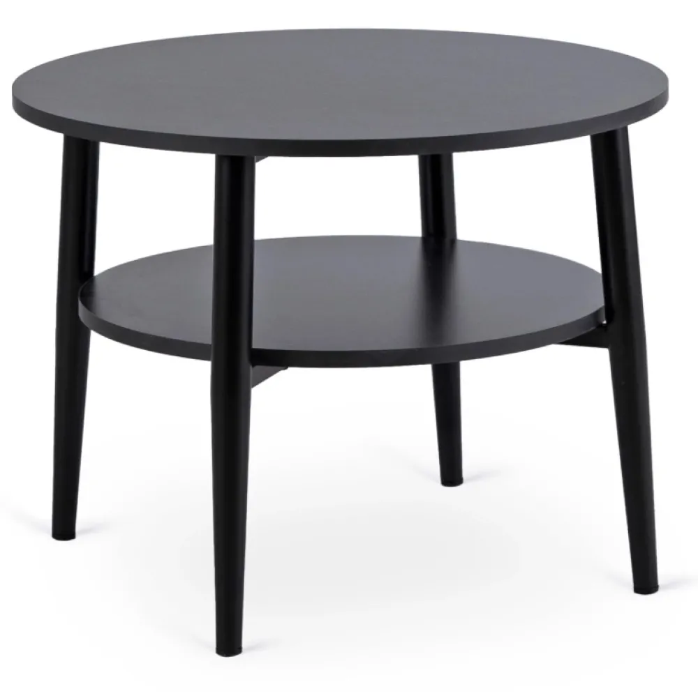 - Stolik kawowy PAVIO z czarnym blatem i czarną stalową podstawą. Wysokość: 45 cm, średnica blatu: 60 cm, średnica półki dolnej: 49 cm. Grubość blatu: 1,6 cm. Materiał: płyta MDF, metal lakierowany proszkowo. Praktyczna półka. Idealny do salonu
