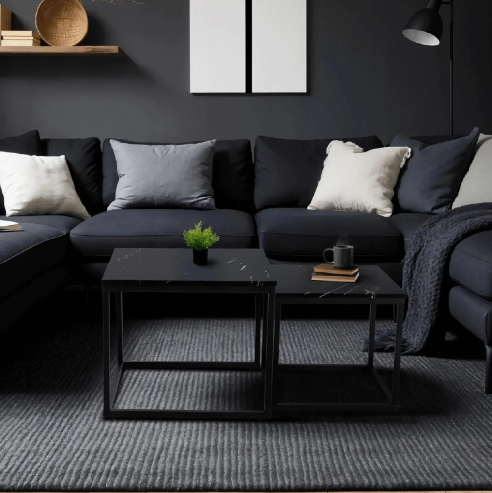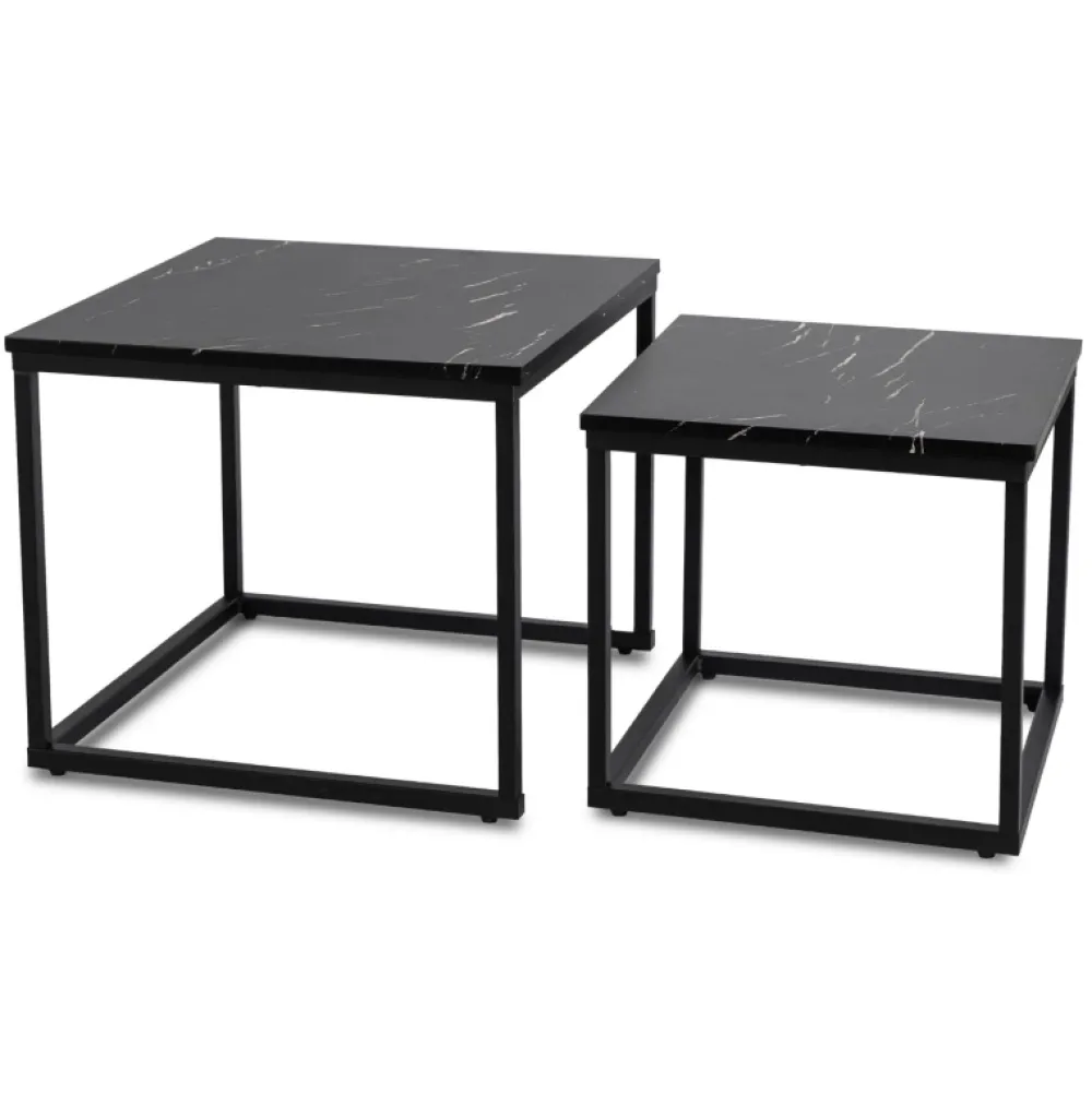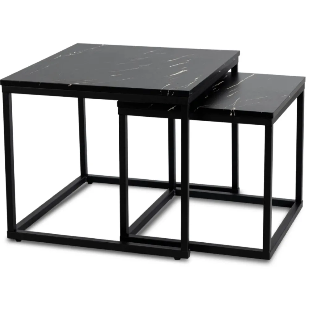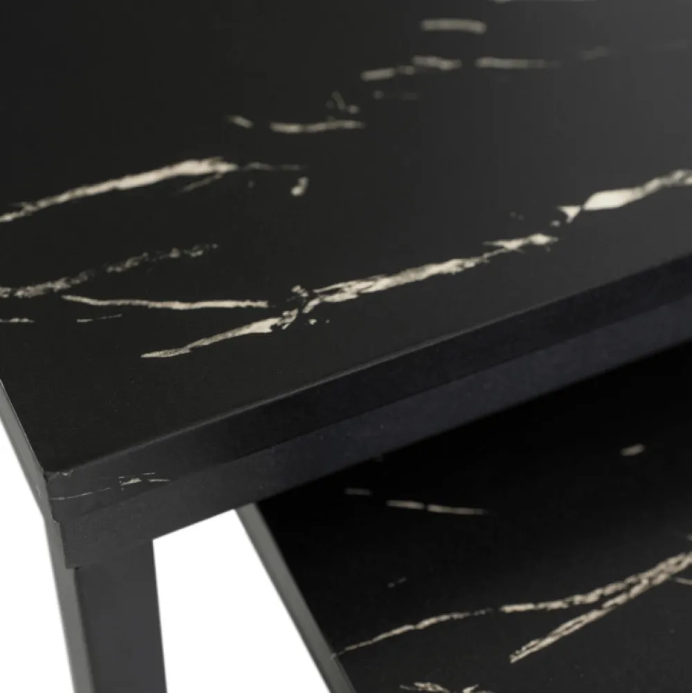 - Zestaw stolików kawowych JUNE z blatami w czarny marmur i stalową podstawą. Dwa rozmiary, możliwość wsunięcia jeden pod drugi. Elegancja i funkcjonalność do salonu, sypialni lub biura. Idealne do nowoczesnych wnętrz.
