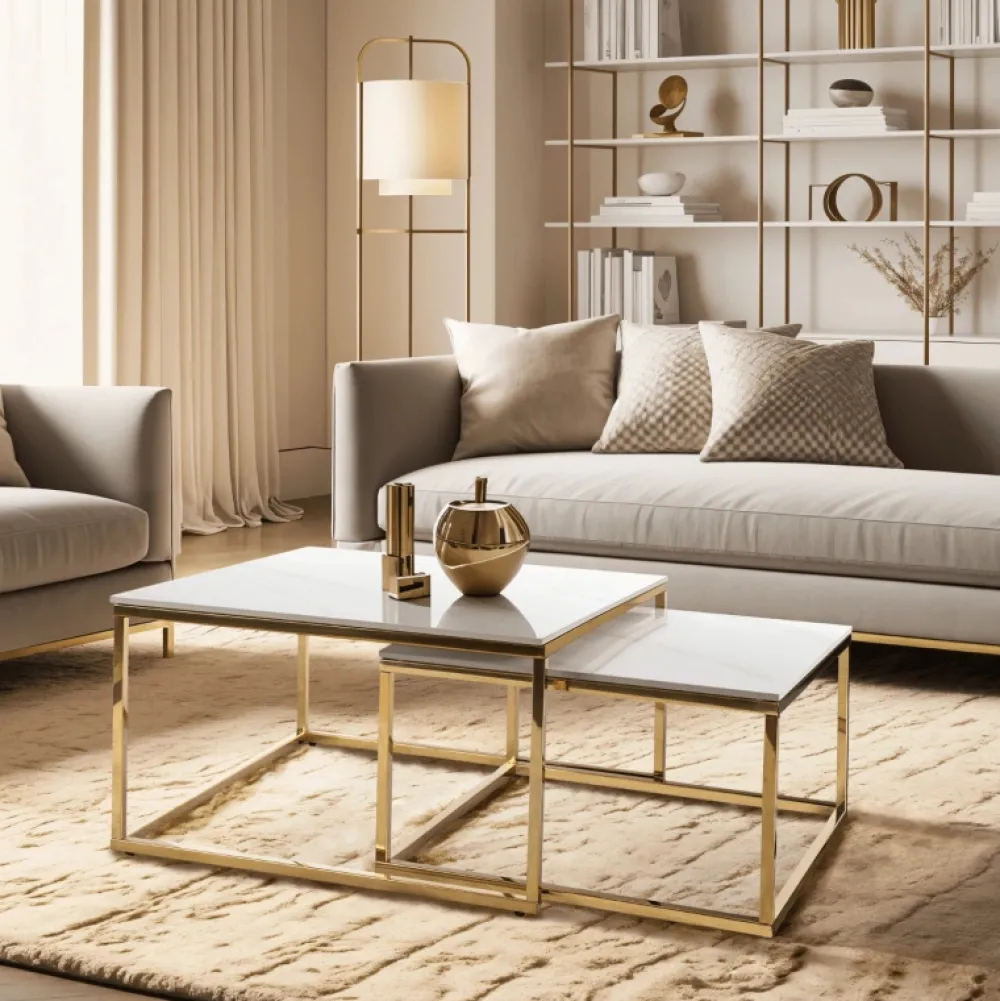 Zestaw stolików kawowych TULIO – subtelna elegancja białego marmuru i złota