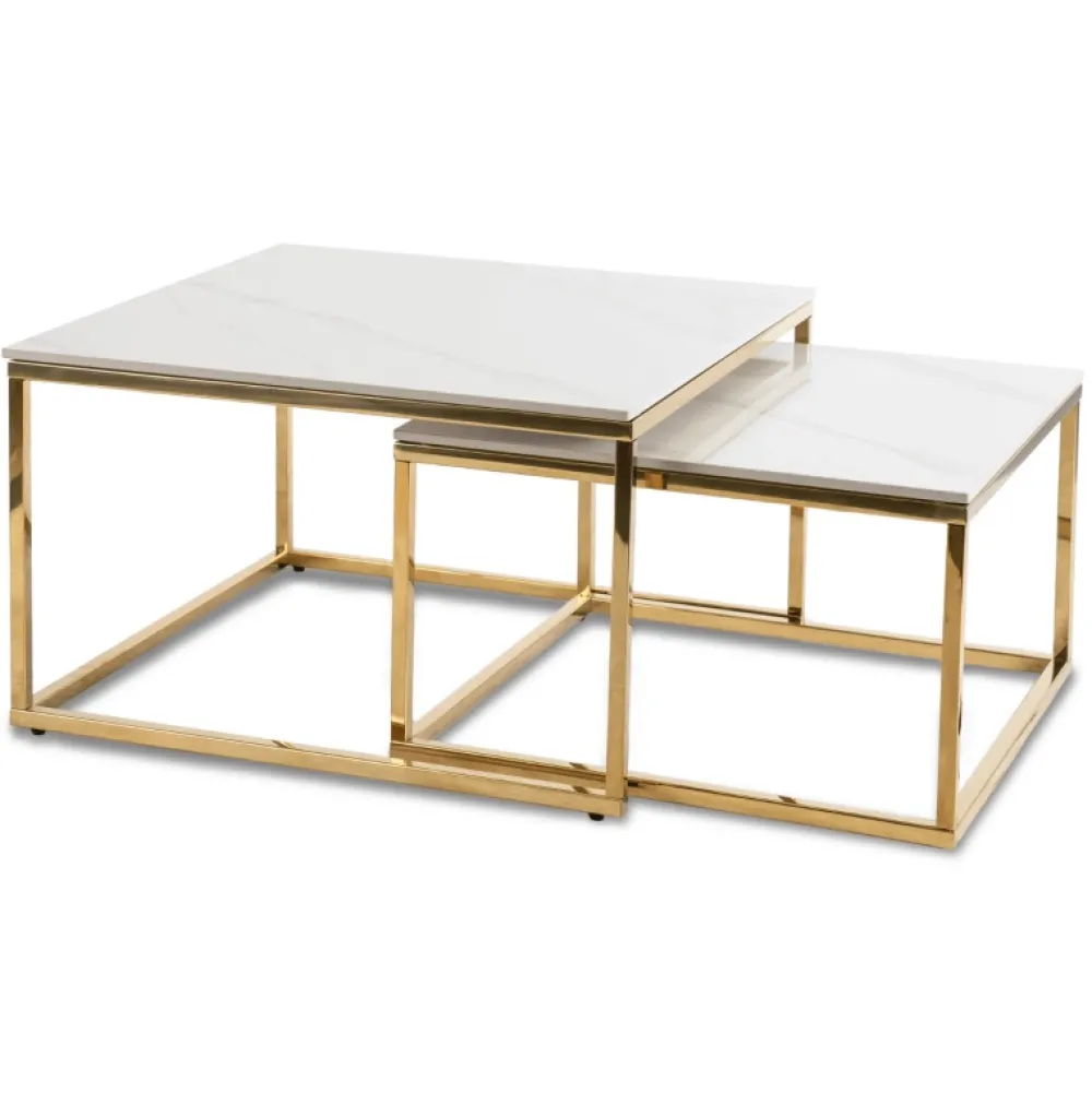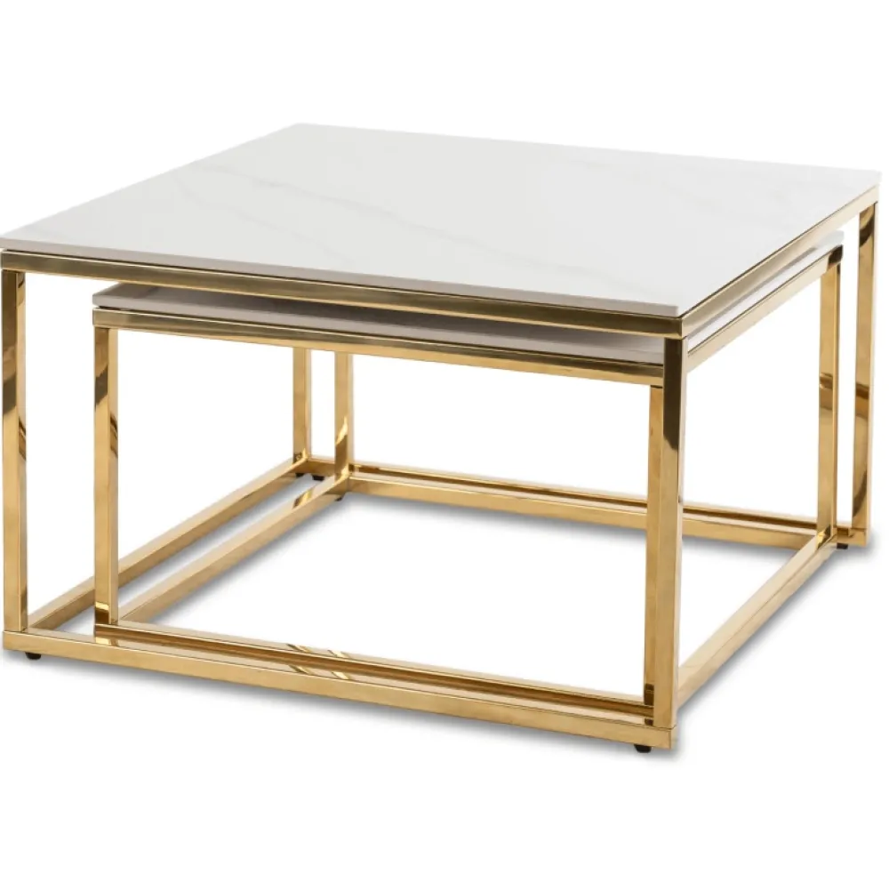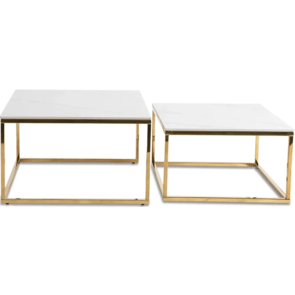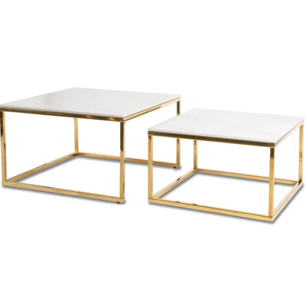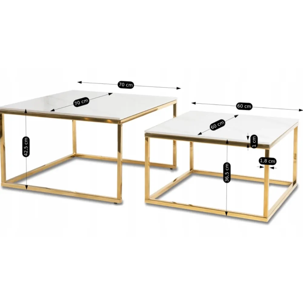 - Zestaw stolików kawowych TULIO z białym marmurowym blatem i złotą podstawą łączy elegancję z funkcjonalnością. Ceramiczne blaty są odporne na wilgoć i łatwe w czyszczeniu. W zestawie dwa stoliki: większy o średnicy 70 cm i mniejszy o średnicy 60 cm.