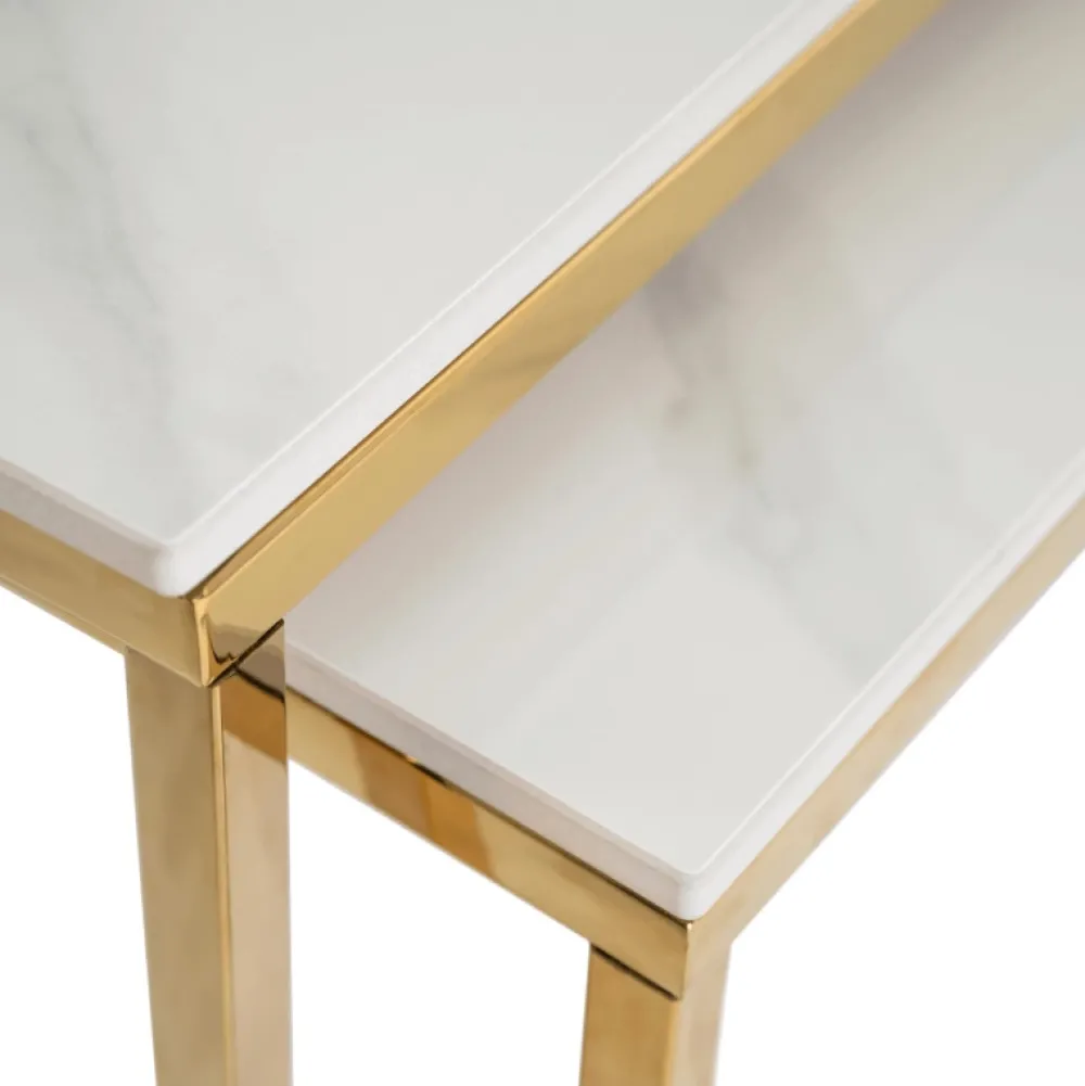 Zestaw stolików kawowych TULIO w wersji z blatem w kolorze białego marmuru i złotą podstawą to kwintesencja stylu i funkcjonalności. Dzięki harmonijnemu połączeniu jasnych tonów i szlachetnych detali, stoliki wniosą do Twojego wnętrza lekkość, świeżość i ponadczasowy charakter.