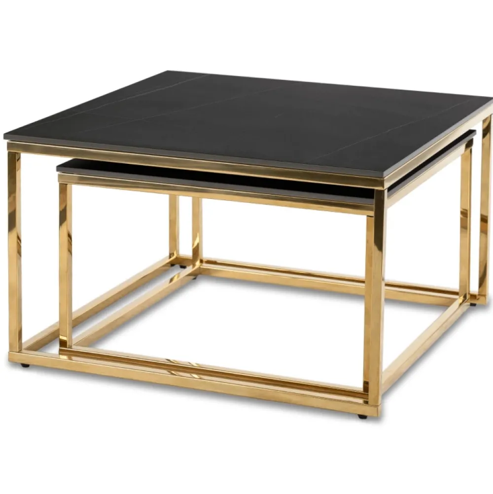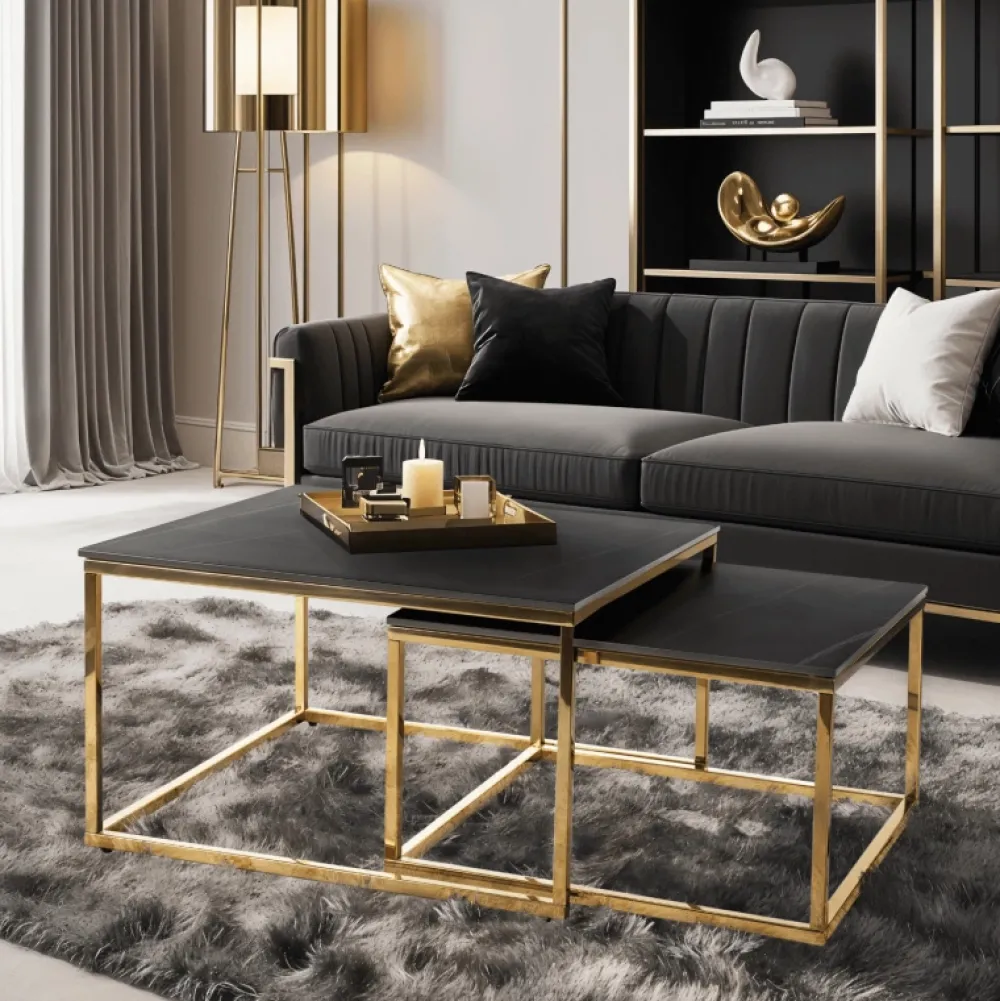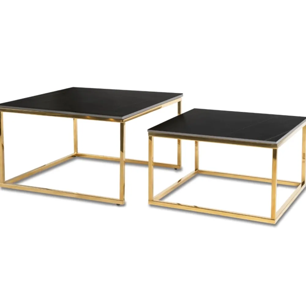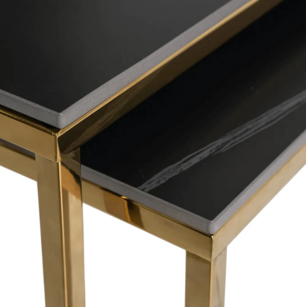 Zestaw stolików kawowych TULIO – elegancja czarnego marmuru i złotego akcentu