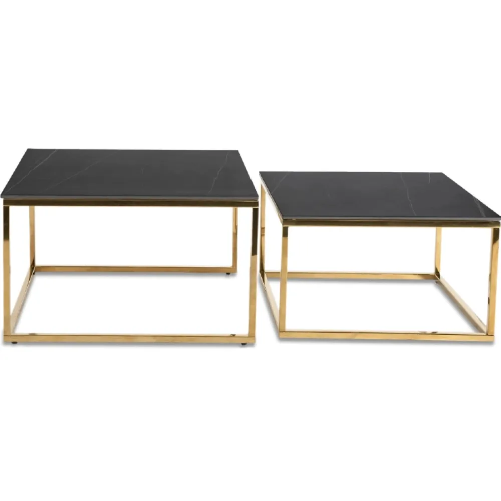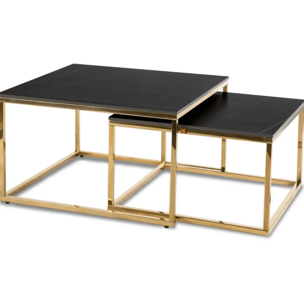 Zestaw stolików kawowych TULIO to nowoczesne i stylowe rozwiązanie, które wniesie do Twojego salonu niepowtarzalny klimat. Połączenie ceramicznego blatu z motywem czarnego marmuru i złotej, metalowej podstawy tworzy efektowną, ale zarazem uniwersalną kompozycję pasującą do wnętrz glamour, modern i minimalistycznych.