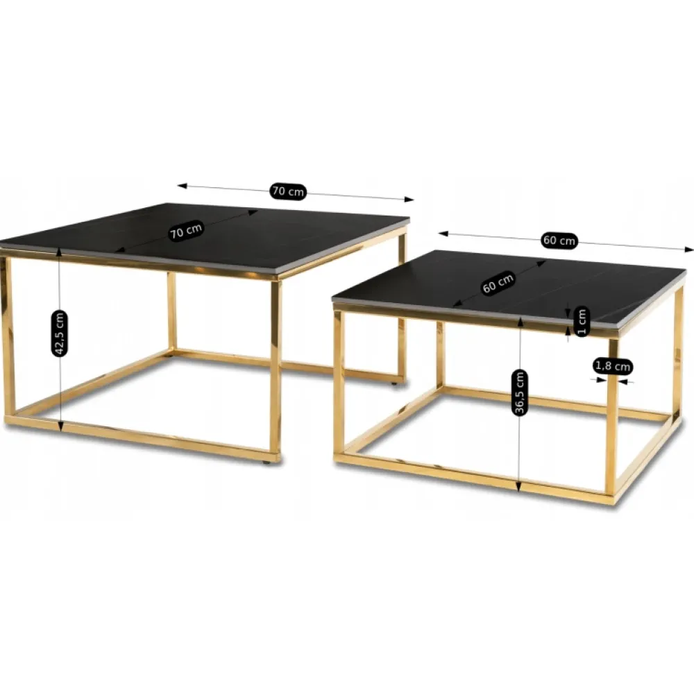 - Zestaw stolików kawowych łączy elegancki czarny marmur z złotym metalowym stelażem,tworząc efektowną kompozycję. Blaty ceramiczne są odporne na wilgoć i łatwe do czyszczenia, a złoty stelaż zapewnia stabilność. W zestawie dwa stoliki o średnicy 70 i 60 cm