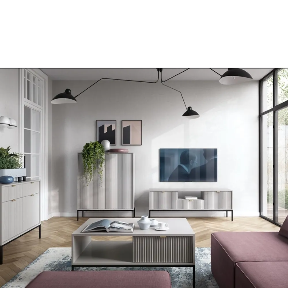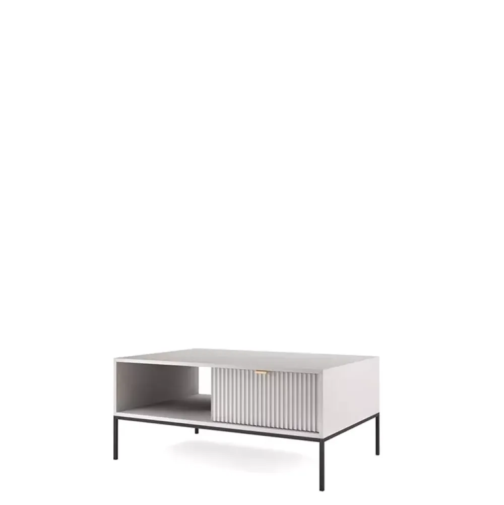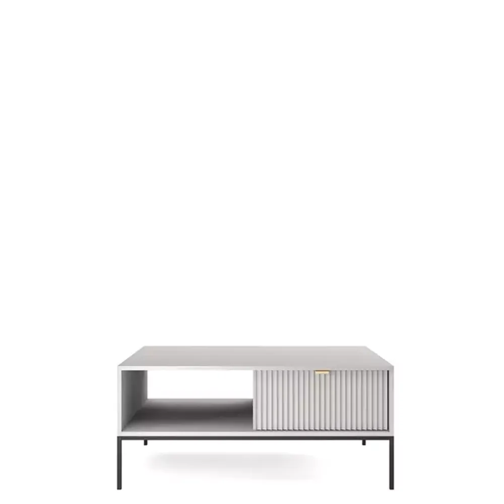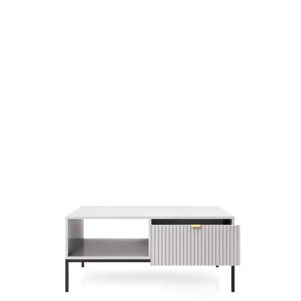 Szary stolik kawowy AVANTI idealnie odnajdzie się w towarzystwie mebli do salonu z kolekcji AVANTI. Ma blat w kształcie prostokąta o wymiarach 104×68, więc bez problemu postawisz na nim paterę z ciastem, gdy wpadną do Ciebie goście na popołudniową kawę. Stolik kawowy ma półkę oraz pojemną szufladę pod blatem, więc znajdziesz miejsce na odłożenie pilota lub czytanego czasopisma. Szara ława z ryflowanym frontem szuflady będzie ozdobą w salonie, jednak ten przepiękny odcień szarości może być tylko bazą do stworzenia Twojej indywidualnej aranżacji.