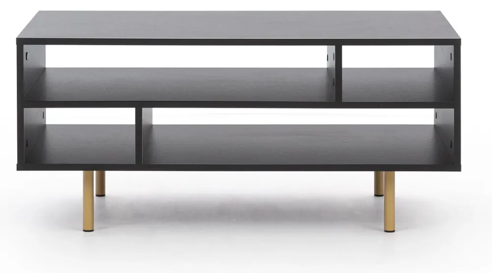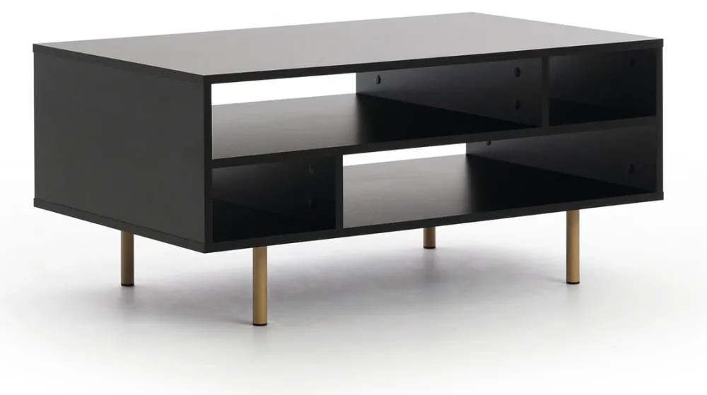 Głęboka, czarna barwa stolika przyciąga wzrok i doda charakteru każdemu wnętrzu. Stolik kawowy posiada także półki, które zapewniają dodatkową przestrzeń do przechowywania, pozwalając na utrzymanie porządku i eksponowanie dekoracji. Wysokie, metalowe nóżki w odcieniu złotego beżu są nie tylko stabilne, ale również stanowią świetny akcent dla czarnego koloru. To połączenie kolorystyczne czyni go wyjątkowym dodatkiem do każdego salonu, podkreślającym indywidualny charakter mieszkania.