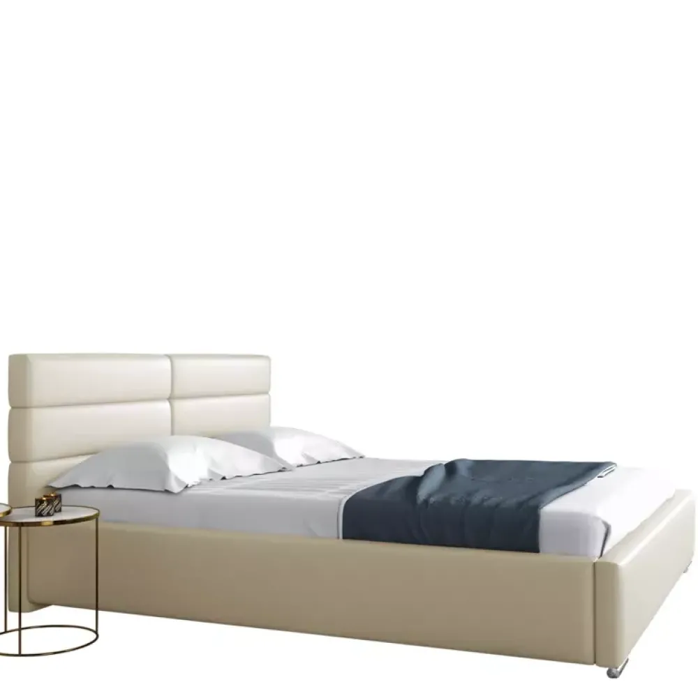 - Łóżko do sypialni z ekoskóry, z wygodnym zagłówkiem wykończonym prostym symetrycznym wzorem. Powierzchnia spania o wymiarach 200×200 cm.