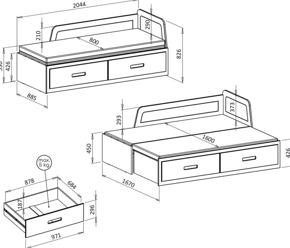 - Łóżko posiada powierzchnię spania wynoszącą 80 × 200 cm, natomiast po rozsunięciu oferuje powierzchnie spania o wartości aż 160 × 200 cm.