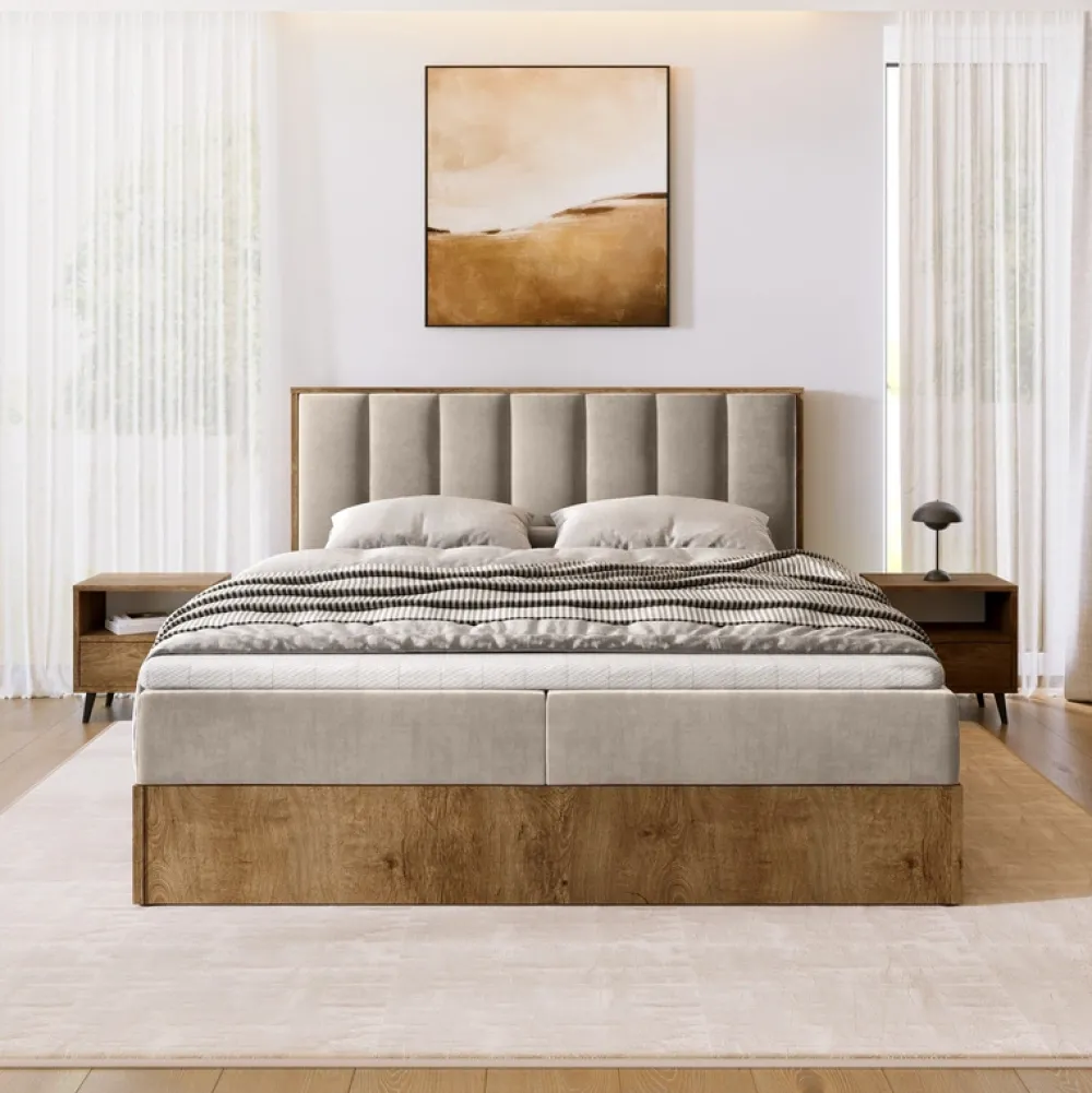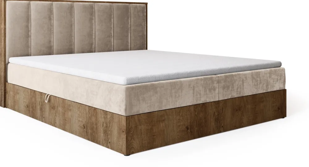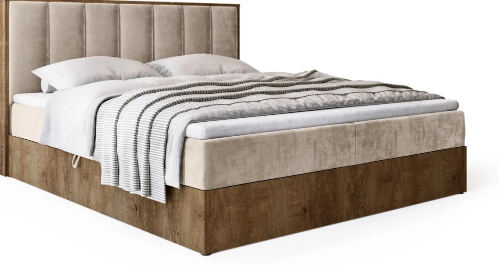 - Łóżko kontynentalne LOFT II w kolorze dębu lefkas 160×200 cm wyposażone jest w materac ze sprężynami bonell odpornymi na odkształcenia i pianką PUR. Pod nim znajdują się dwa pojemniki na pościel z mechanizmem ułatwiającym otwieranie. Tkanina Paros 02