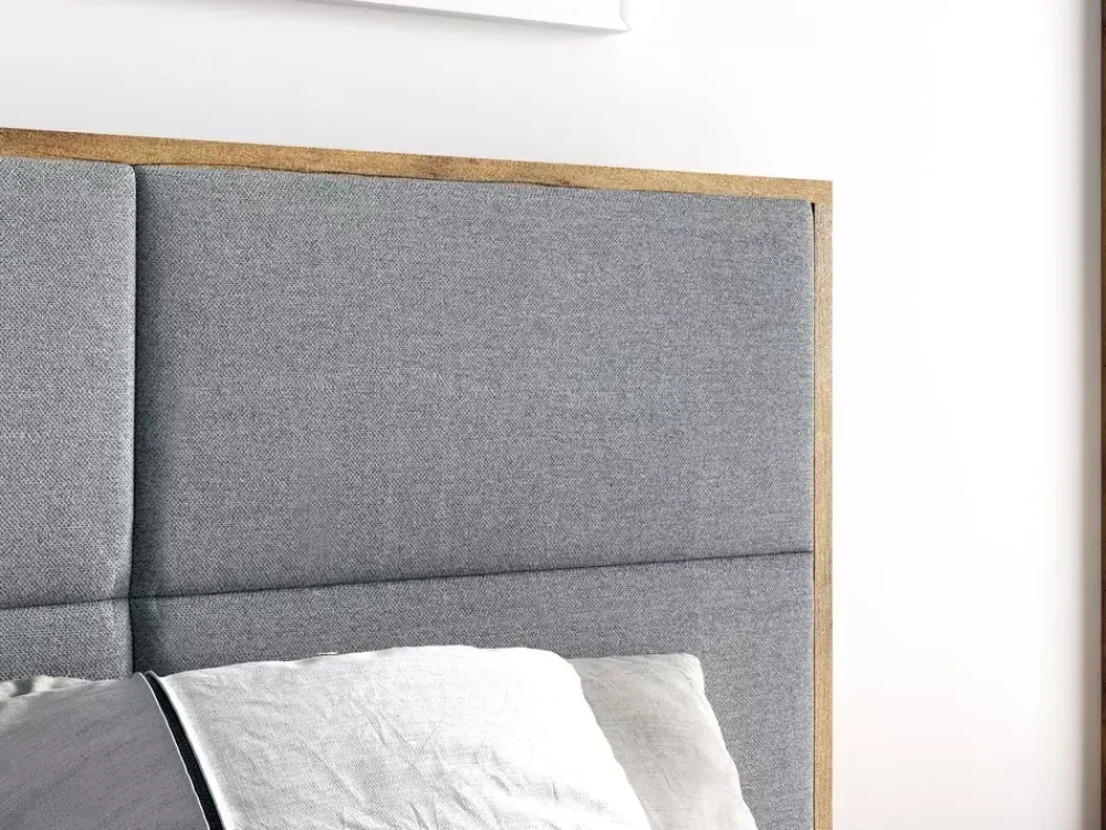 Tapicerowany zagłówek z przeszyciami w kształcie prostokątów dodaje ciekawy element wizualny, tworząc stylowy punkt centralny w każdej sypialni.