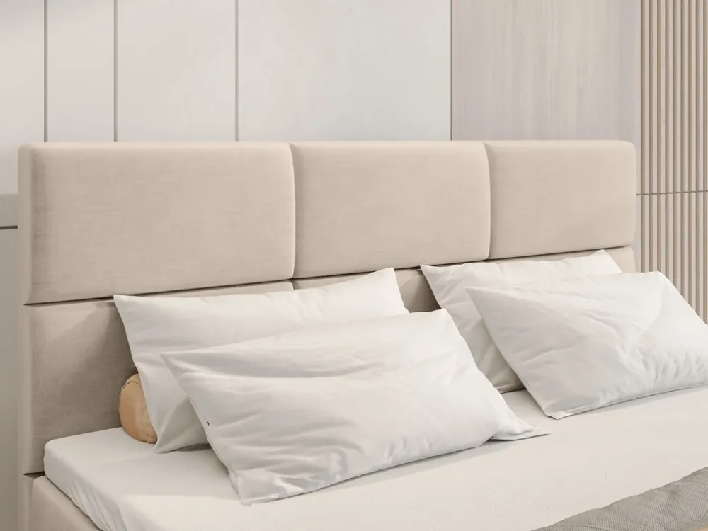 Beżowe łóżko kontynentalne 160×200 BOSTON to idealne połączenie nowoczesności i komfortu dla osób, które cenią sobie wygodę oraz solidne i estetyczne wykonanie. Nowoczesne łóżko kontynentalne z pojemnikiem na pościel posiada zagłówek z ozdobnymi przeszyciami tworzącymi sześć prostokątów.