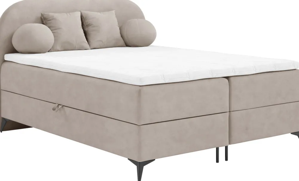 Łóżko 160×200 cm z pojemnikiem wyróżnia się także nowoczesnym wyglądem, dzięki wysokim, metalowym nogom, które nadają mu lekkości i elegancji, jednocześnie ułatwiając sprzątanie pod łóżkiem. Dwa przestronne pojemniki rozkładane automatami sprężynowymi umożliwiają łatwy dostęp do przechowywanych pościeli, koców czy poduszek, co pozwala utrzymać sypialnię w porządku i zapewnia dodatkowe miejsce na rzeczy codziennego użytku.