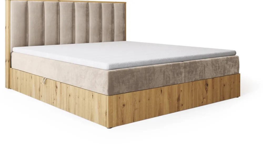 - Łóżko kontynentalne LOFT II w kolorze dąb artisan 160×200 cm wyposażone jest w materac ze sprężynami bonell odpornymi na odkształcenia i pianką PUR. Pod nim znajdują się dwa pojemniki na pościel z mechanizmem ułatwiającym otwieranie. Tkanina Paros 02