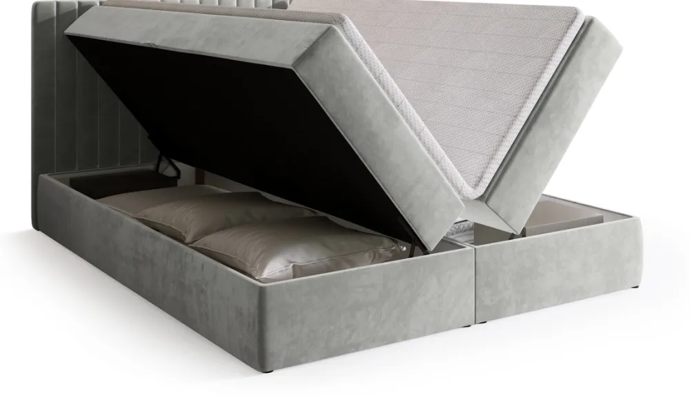 - Łóżko posiada dwa głębokie pojemniki na pościel. Za dostęp do pojemników odpowiada automat sprężynowy, który przejmuje na siebie część obciążenia, przez co znacząco ułatwia rozkładanie.