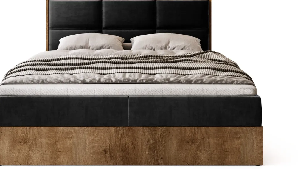 - Łóżko kontynentalne 180×200 cm LOFT zostało wykonane w kolorze dąb lefkas oraz czarnej tkaninie welurowej z efektem pisania. Łóżko posiada materac na bazie sprężyn bonell oraz pianki PUR, dwa głębokie pojemniki na pościel oraz tapicerowany zagłówek.