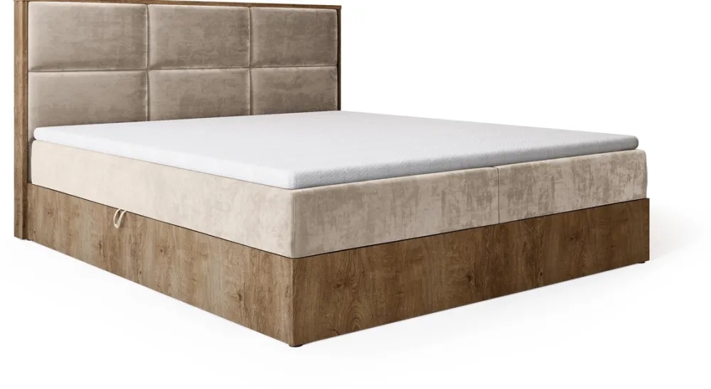 Z myślą o wygodzie użytkowania, łóżko zostało wyposażone w sprężynowy automat rozkładania, który ułatwia dostęp do pojemników bez zbędnego wysiłku. To rozwiązanie nie tylko podnosi komfort użytkowania, ale również podkreśla nowoczesny charakter mebla.