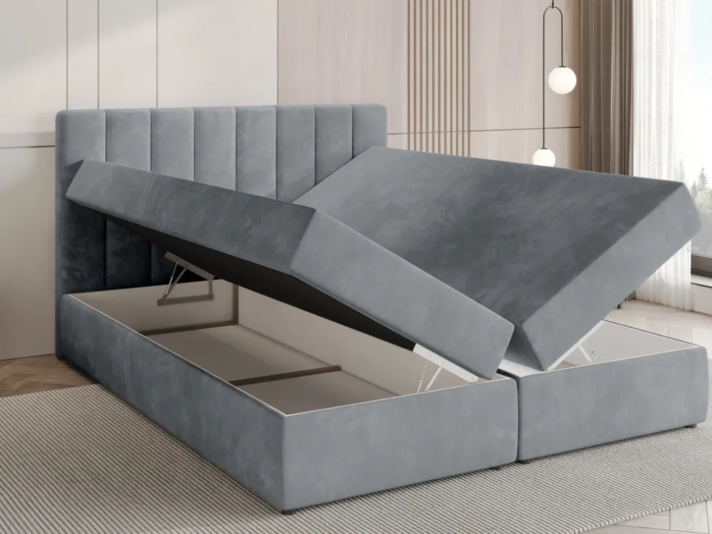 - Łóżko posiada dwa głębokie pojemniki na pościel. Za dostęp do pojemników odpowiada automat sprężynowy, który przejmuje na siebie część obciążenia, przez co znacząco ułatwia rozkładanie.