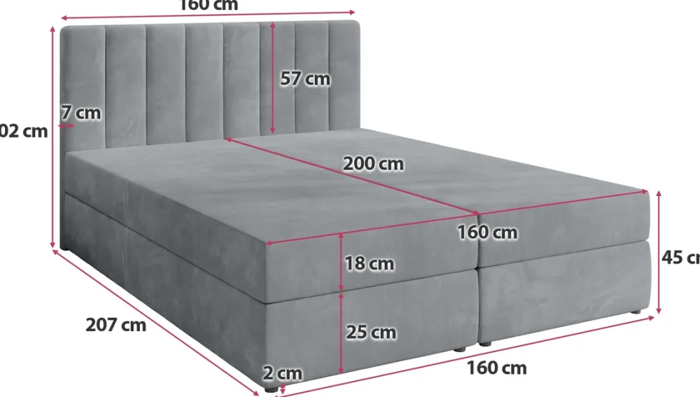 - Łóżko kontynentalne 160×200 cm DENVER zostało wyposażone w pojemnik na pościel otwierany za pomocą automatu sprężynowego. Średnio twardy materac łóżka składa się ze sprężyn bonell oraz pianki T-30, gwarantując wysoki komfort snu.