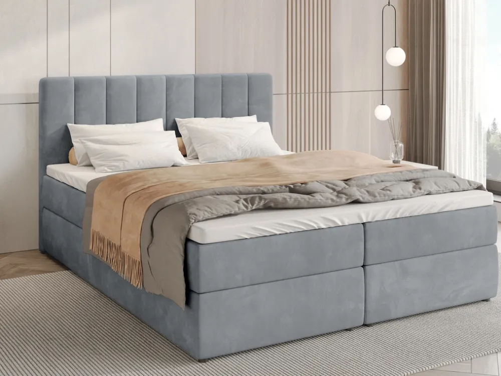 Łóżko kontynentalne 160×200 cm DENVER to propozycja dla osób poszukujących komfortowego, oraz nowoczesnego łóżka. Łóżko kontynentalne z pojemnikiem zostało wyposażone w tapicerowany zagłówek we wzorze szerokich słupków, które doskonale zdobią pomieszczenie swą prostotą.