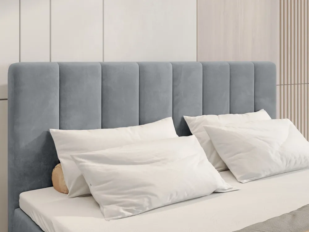 - Łóżko przestawione na wizualizacji zostało wykonane w tkaninie KRONOS 53. Tkanina posiada gęste i miłe w dotyku włosie, a mikrowłoski zmieniają swoje ułożenie po przejechaniu dłonią. Materiał ma zwiększony współczynnik na działanie światła, stąd też to piękne mienienie się tkaniny. Nadaje to szyku i ekskluzywnej nutki. Mimo tego, że tkanina jest delikatna i miękka, to jest też odporna na mechacenie się i nie tak łatwo ją uszkodzić.