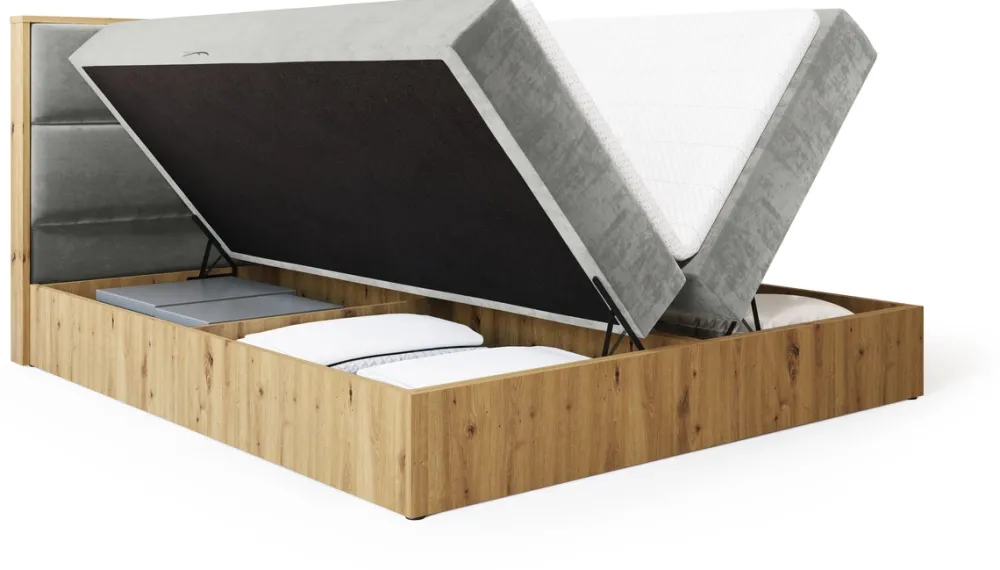 Łóżko wyposażone jest w dwa pojemniki na pościel, które są nie tylko praktycznym, ale i eleganckim rozwiązaniem do przechowywania. Dzięki sprężynowemu automatowi rozkładania dostęp do nich jest szybki i bezproblemowy, co ułatwia codzienną organizację i pomaga utrzymać porządek w sypialni.