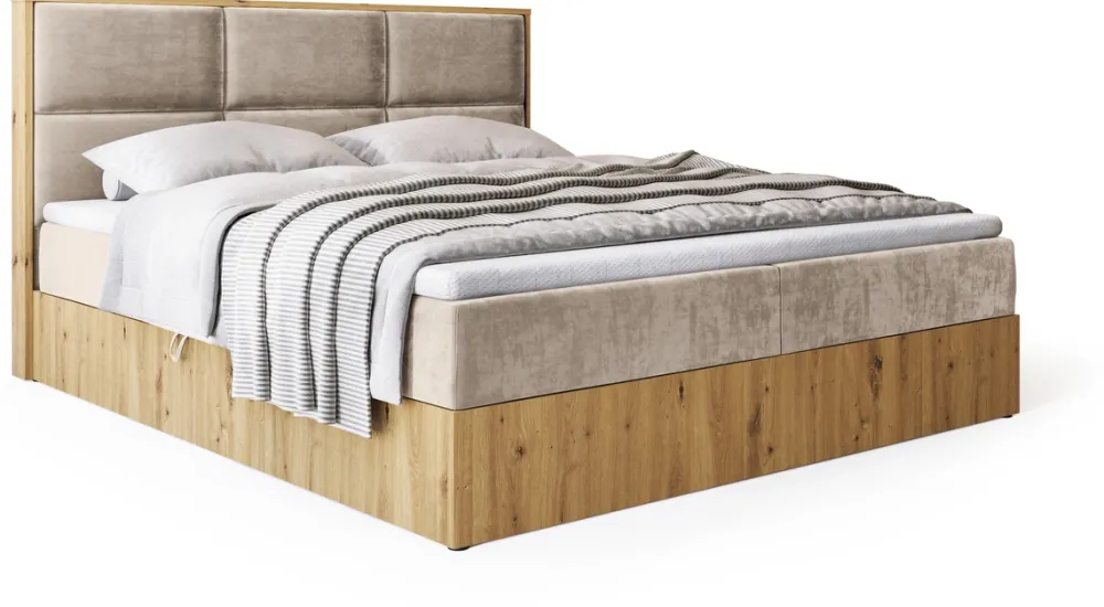 Łóżko wyposażone jest w dwa pojemniki na pościel, które są nie tylko praktycznym, ale i eleganckim rozwiązaniem do przechowywania. Dzięki sprężynowemu automatowi rozkładania dostęp do nich jest szybki i bezproblemowy, co ułatwia codzienną organizację i pomaga utrzymać porządek w sypialni.