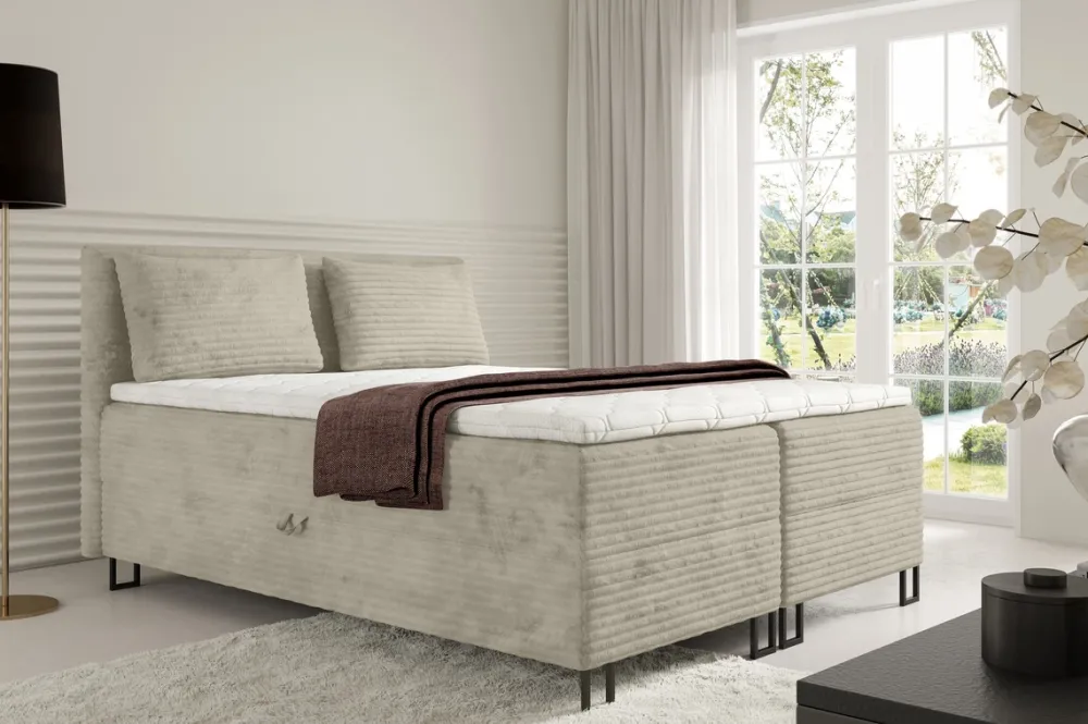 - Łóżko kontynentalne zostało obite wyjątkową tkaniną Tilia, która jest grubym sztruksem, wyróżniającym się miękką, prążkowaną strukturą. Ten materiał nie tylko dodaje meblowi elegancji, ale także wprowadza do wnętrza przytulność, zapewniając przyjemne doznania dotykowe i wizualne.