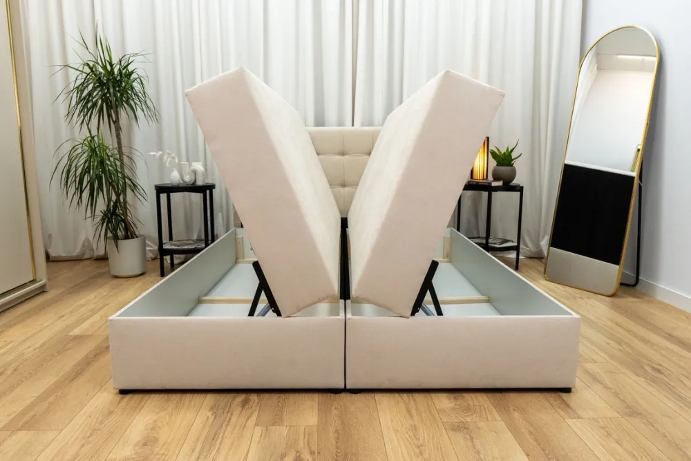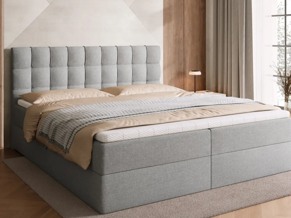 Łóżko kontynentalne do sypialni posiada dwa pojemniki na pościel, które pozwalają na przechowanie pościeli i nie tylko. Automat sprężynowy wspomaga otwieranie pojemnika, co czyni dostęp do jego zawartości prostym i komfortowym.