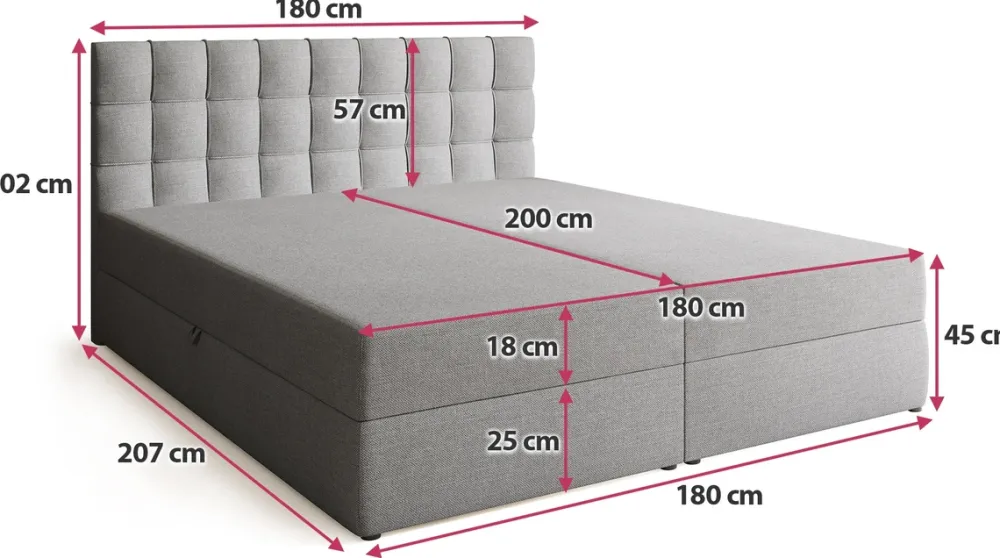 - Łóżko kontynentalne 180×200 DETROIT wykończono tkaniną, plecionką Malmo, która charakteryzuje się odpornością na mechacenie. Materac łózka wykonano na bazie sprężyn bonell oraz pianki T-30. Za dostęp do pojemnika odpowiada sprężynowy automat rozkładania.