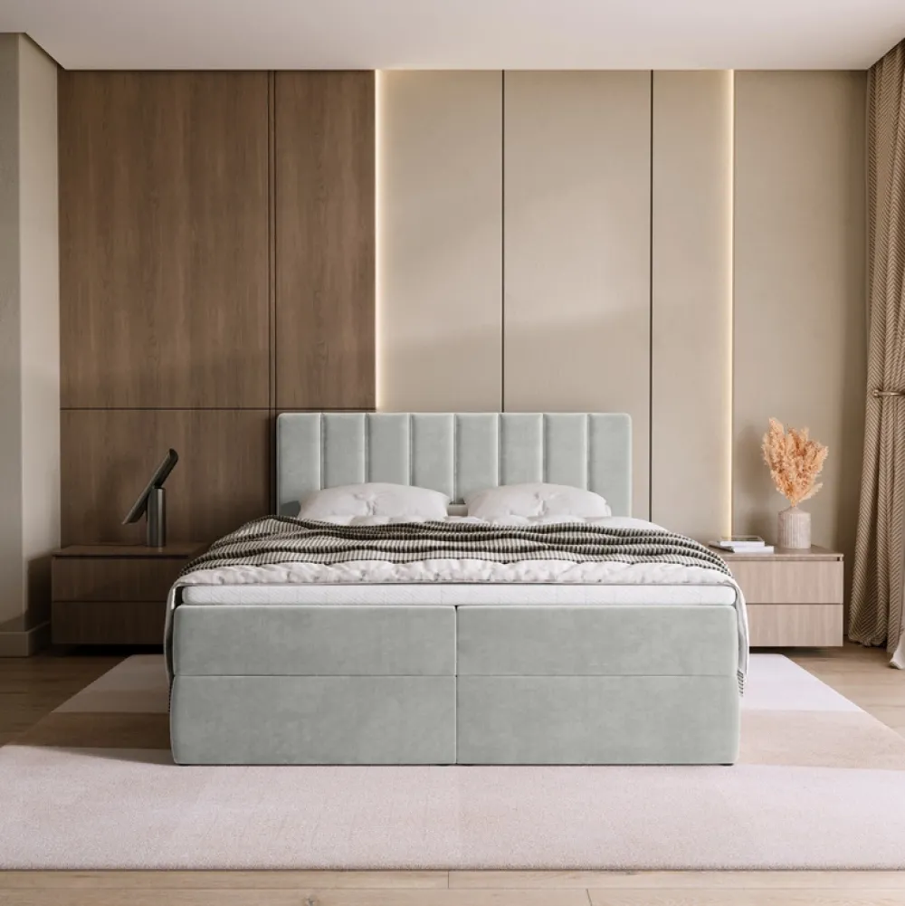 Łóżko kontynentalne 160×200 cm DENVER to propozycja dla osób poszukujących komfortowego, oraz nowoczesnego łóżka. Łóżko kontynentalne z pojemnikiem zostało wyposażone w tapicerowany zagłówek we wzorze szerokich słupków, które doskonale zdobią pomieszczenie swą prostotą.