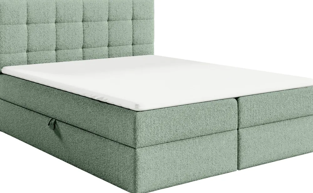Łóżko kontynentalne zostało obite wyjątkową tkaniną boucle Abriamo, której miękka, pętelkowa struktura przypomina futro baranka. Materiał ten jest nie tylko niezwykle przyjemny w dotyku, ale również wytrzymały, co pozwala na długo cieszyć się estetycznym wyglądem łóżka.