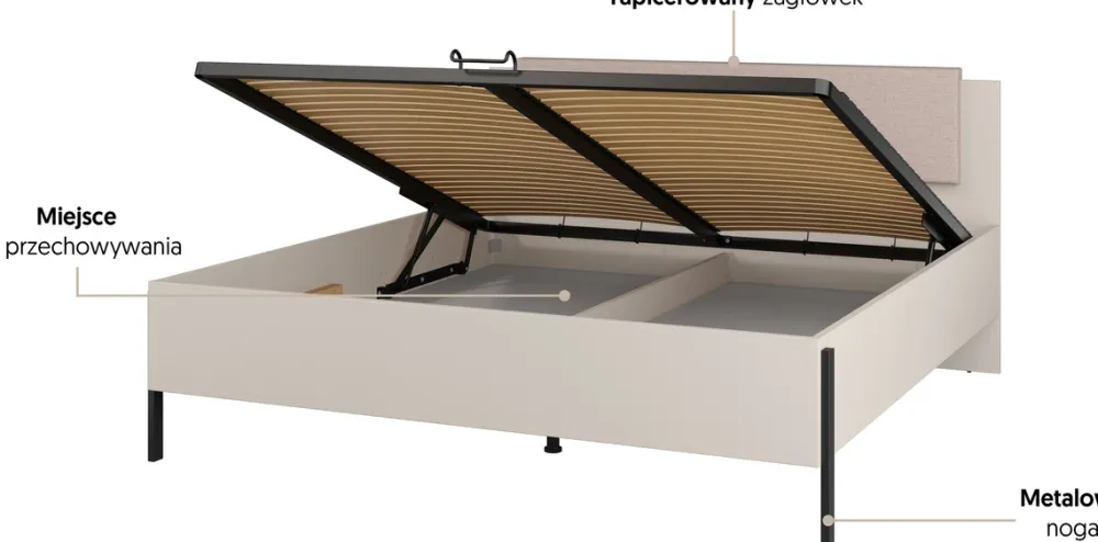 - Pojemny schowek pod stelażem – perfekcyjny na zapasową pościel, koce czy sezonowe tekstylia