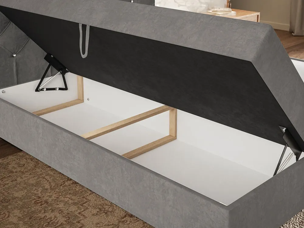 - Łóżko posiada pojemnik na pościel o wysokości 26 cm podzielony na dwie części, którego rozkładanie jest wspomagane za pomocą automatu sprężynowego.