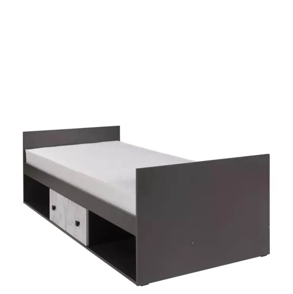 - Funkcjonalne łóżko o wymiarach materaca 90×200 z pojemnikiem na pościel na podnoszonym automacie, wyposażone w półki oraz szufladę, meble młodzieżowe TOM