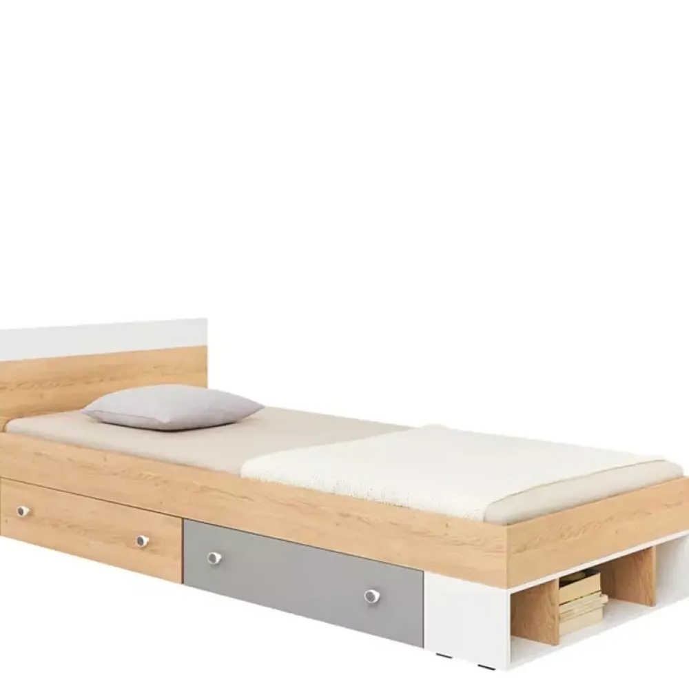Łóżko młodzieżowe z serii PATHE. Posiada dwie szuflady, które bez problemu pomieszczą pościel oraz poduszki. Na froncie znalazło się miejsce na kilka półek na drobiazgi. Łóżko wyposażono w stelaż z płyty meblowej z otworami, aby zapewnić odpowiednią wentylację materaca. W zestawie nie ma dedykowanego materaca dla tego łóżka, lecz poniżej opisu w sekcji – POLECANE, znajdą państwo nasze rekomendacje..