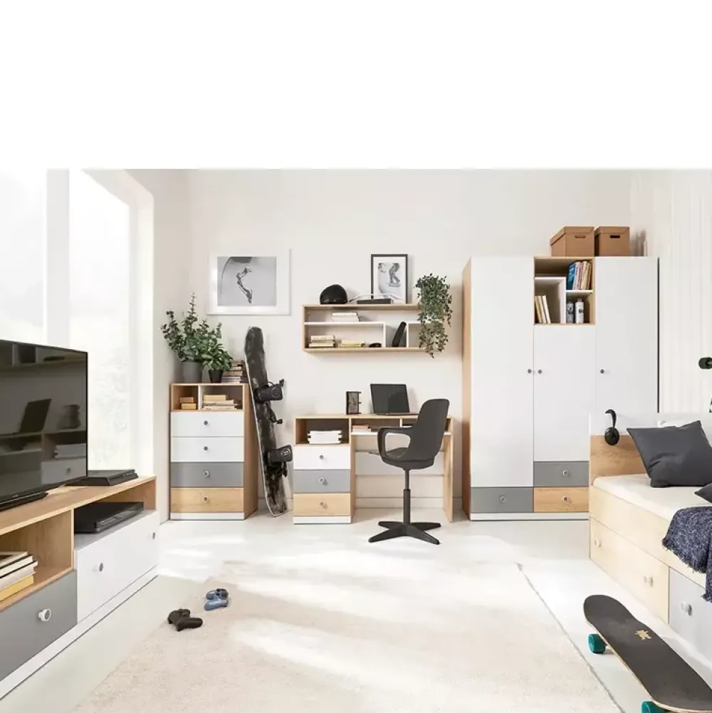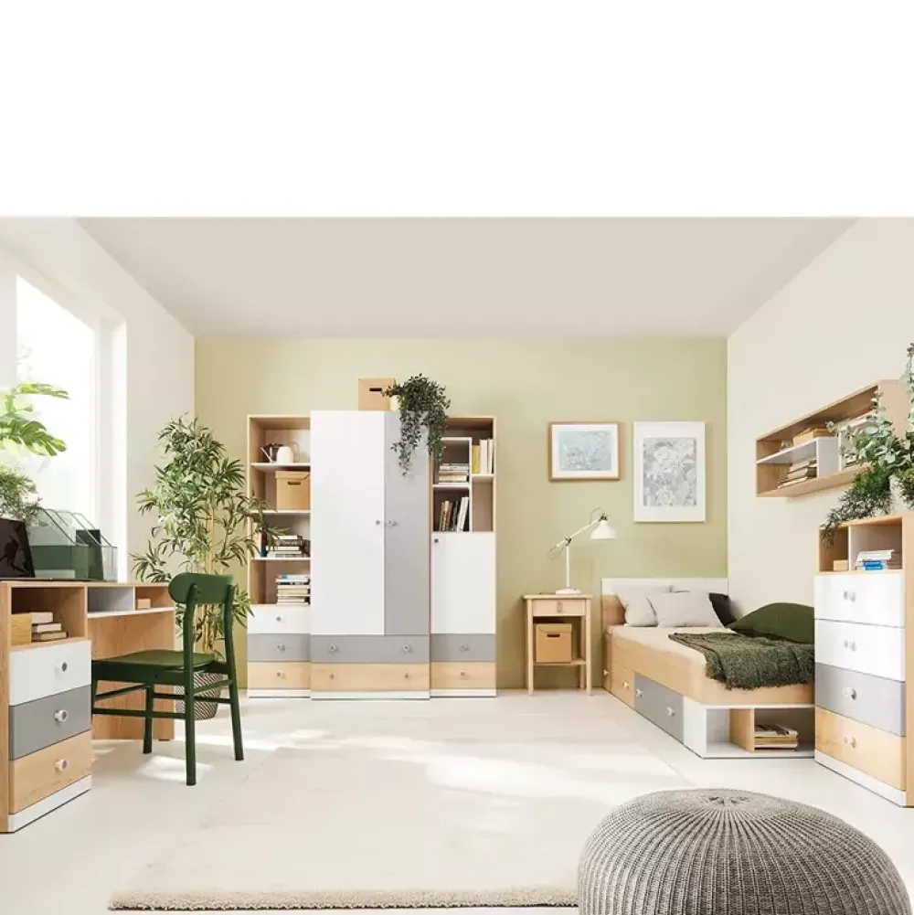 Łóżko do pokoju młodzieżowego z kolekcji PATHE. Wyposażone w dwie duże szuflady, które z łatwością mogą pełnić funkcję pojemników na pościel. Od przodu łóżka umieszczono kilka niewielkich wnęk na drobne przedmioty. Łóżko posiada stelaż pod materac w formie płyty meblowe z otworami zapewniającymi wentylację materaca. Łóżko sprzedawane jest bez dedykowanego materaca, lecz nasz rekomendacje znajdą państwo poniżej opisu w sekcji POLECANE.