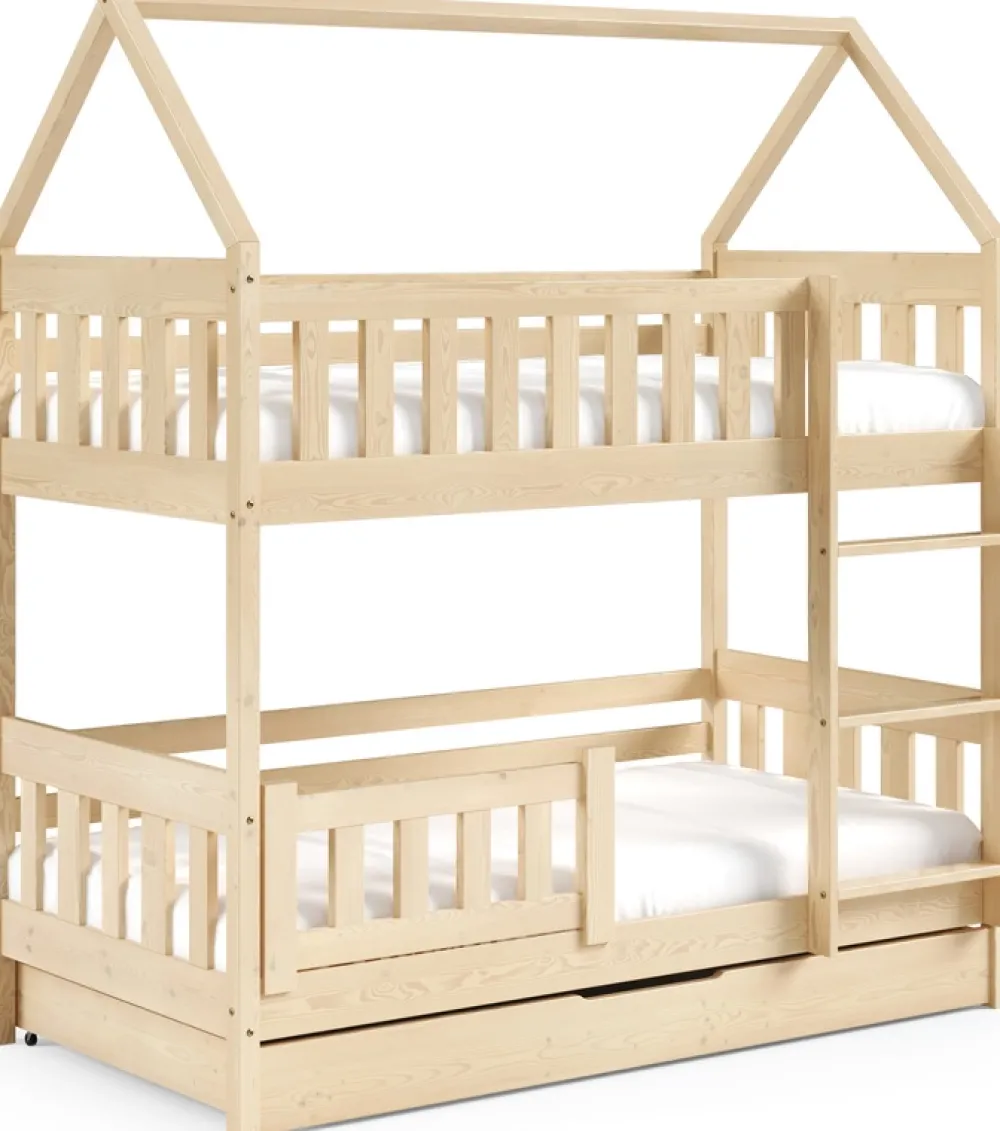 - Piętrowe łóżko MELANIA idealne do pokoju dziecięcego. Wyposażone w dwie powierzchnie spania o wymiarach 80×160 cm, barierki ochronne, drabinkę oraz szufladę pełniącą role pojemnika na pościel. Wykonane z drewna sosnowego.