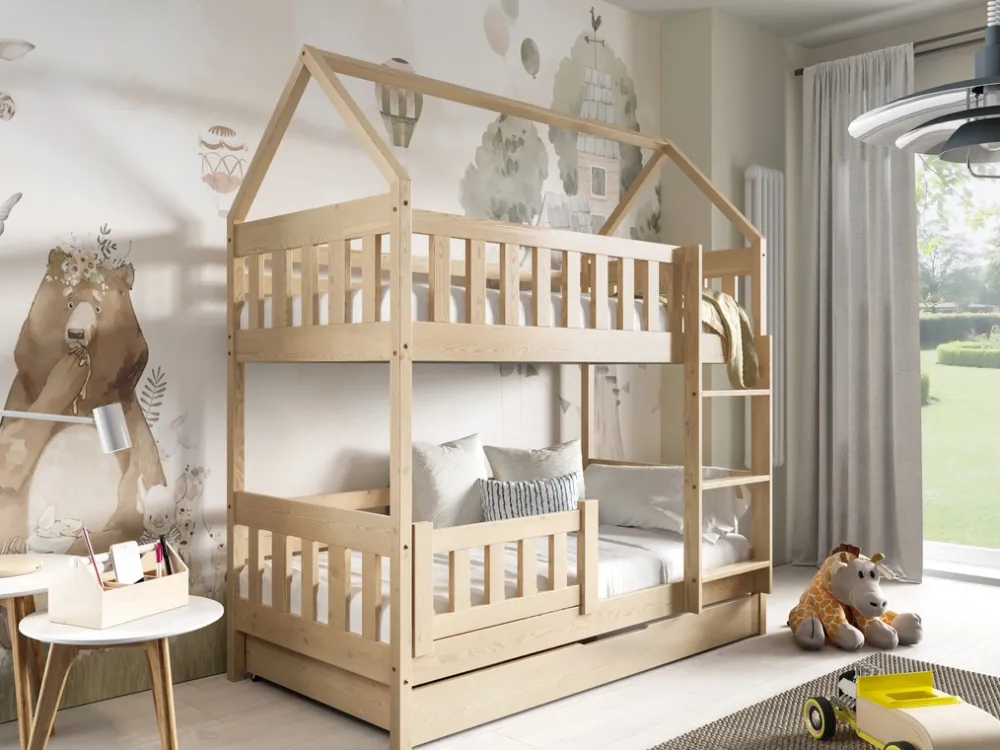 Unikalność naszego łóżka piętrowego podkreśla jego adaptacyjność – drabinkę z łatwością można zamontować zarówno po prawej, jak i lewej stronie łóżka, co pozwala na elastyczne dopasowanie do indywidualnych potrzeb i wymagań każdej przestrzeni. Naturalne wybarwienie sosny, z którego wykonany jest mebel, wnosi do pokoju ciepło i harmonię, tworząc przytulną atmosferę sprzyjającą odpoczynkowi.