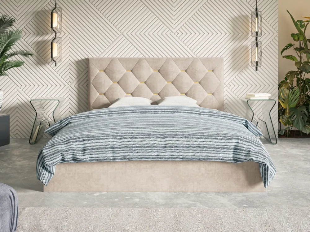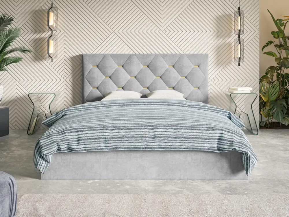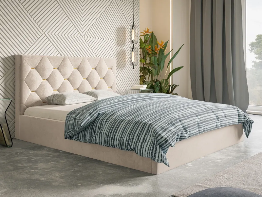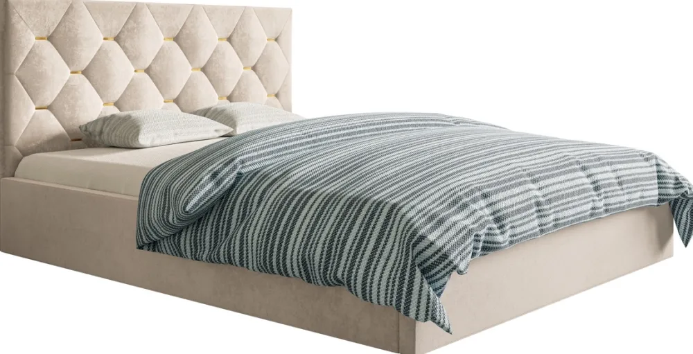 - Łóżko do nowoczesnej sypialni, o niższej konstrukcji ramki otaczającej materac, idealna dla osób niższych, jej wysokość to jedyne 31 cm. W konfiguratorze obok wyboru tkaniny, rodzaju stelaża znajdą państwo także możliwość zmiany wysokości stelaża.
