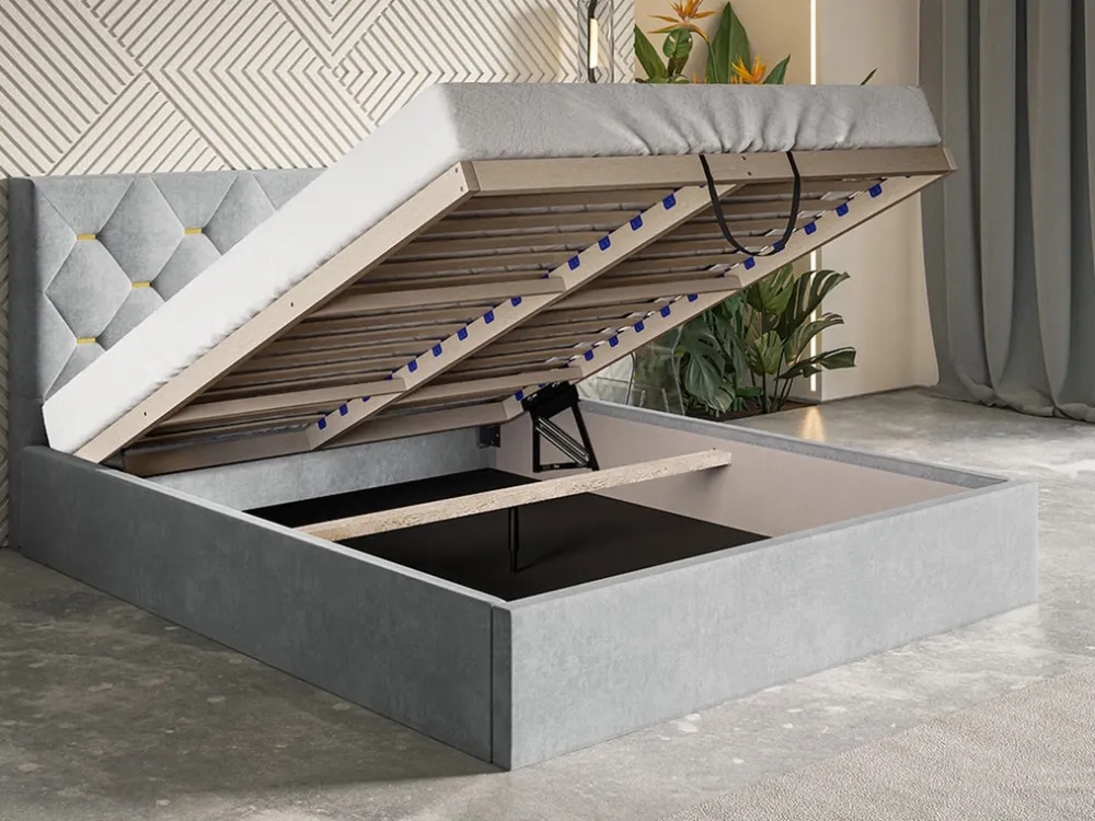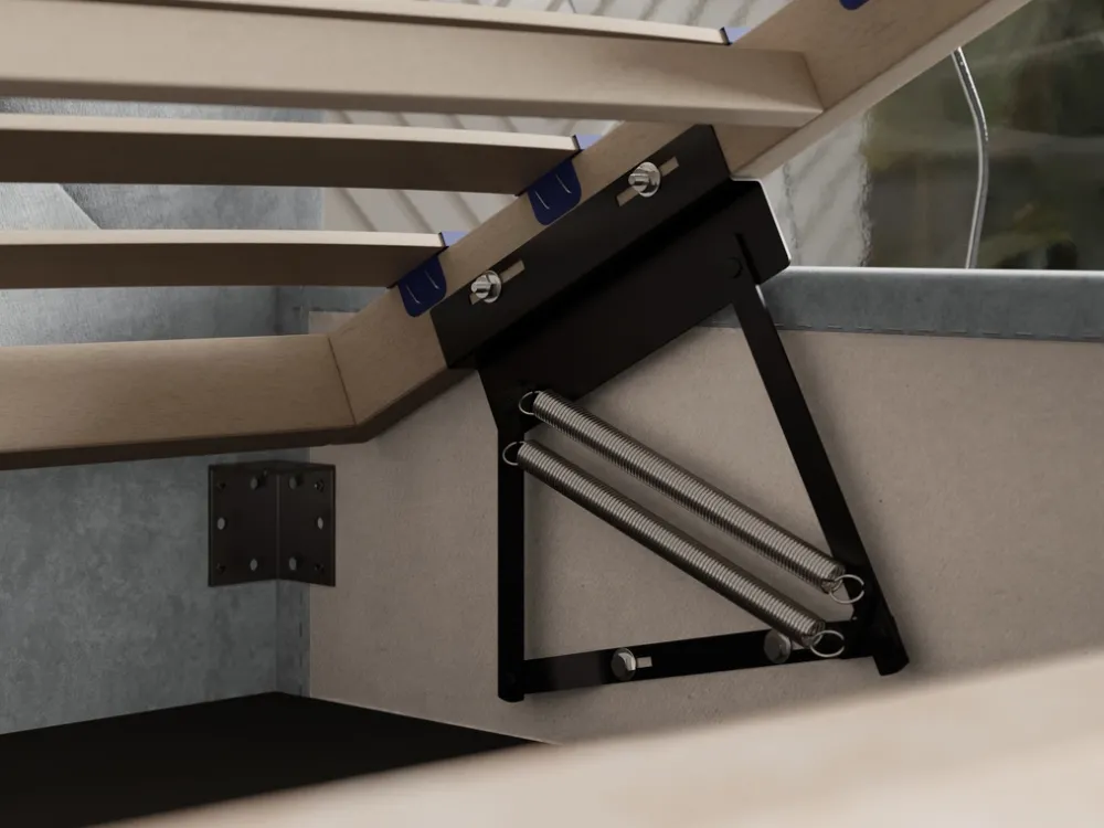 - Łóżko w standardzie wyposażone jest w drewniany stelaż składający się z 32 brzozowych listew, mocowanych w plastikowych uchwytach, stelaż w całości unoszony jest na podnośnikach sprężynowych. Rama stelaża wykonana jest ze sklejki. Rączka do podnoszenia wykonana jest w losowym kolorze, element niewidoczny po nałożeniu materaca. Poszczególne listewki oddalone są od siebie o około 5-5,5 cm. Maksymalne obciążenie stelaża to 200kg.