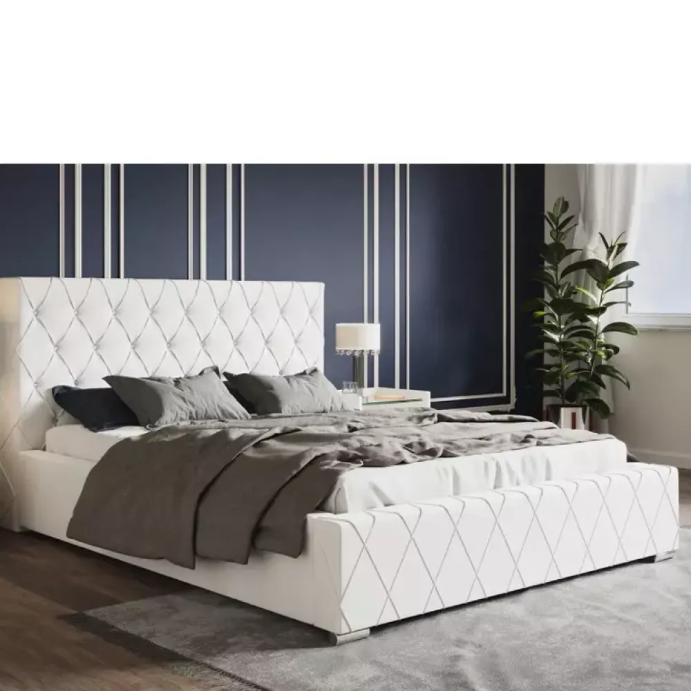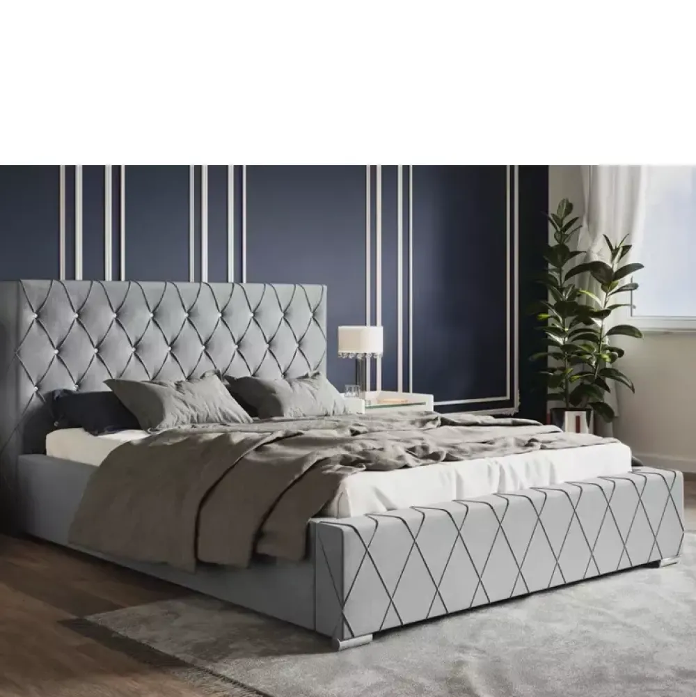 - Stylowe łóżko tapicerowane 120×200 cm z miękkim oparciem wykończonym w subtelny wzór caro z eleganckimi zakładkami. Wysokość zagłówka, rodzaj stelaża, kolor obicia tkanina można wybrać spośród opcji dostępnych w naszym konfiguratorze „Dopasuj i kup”.