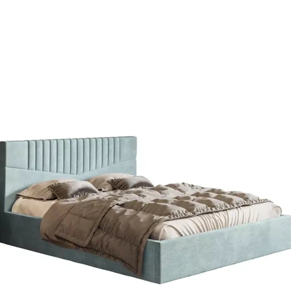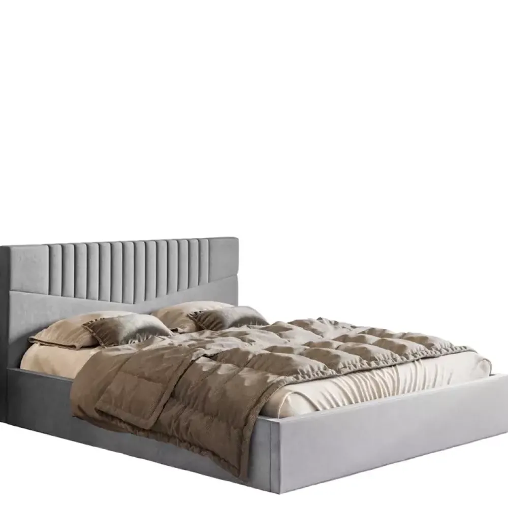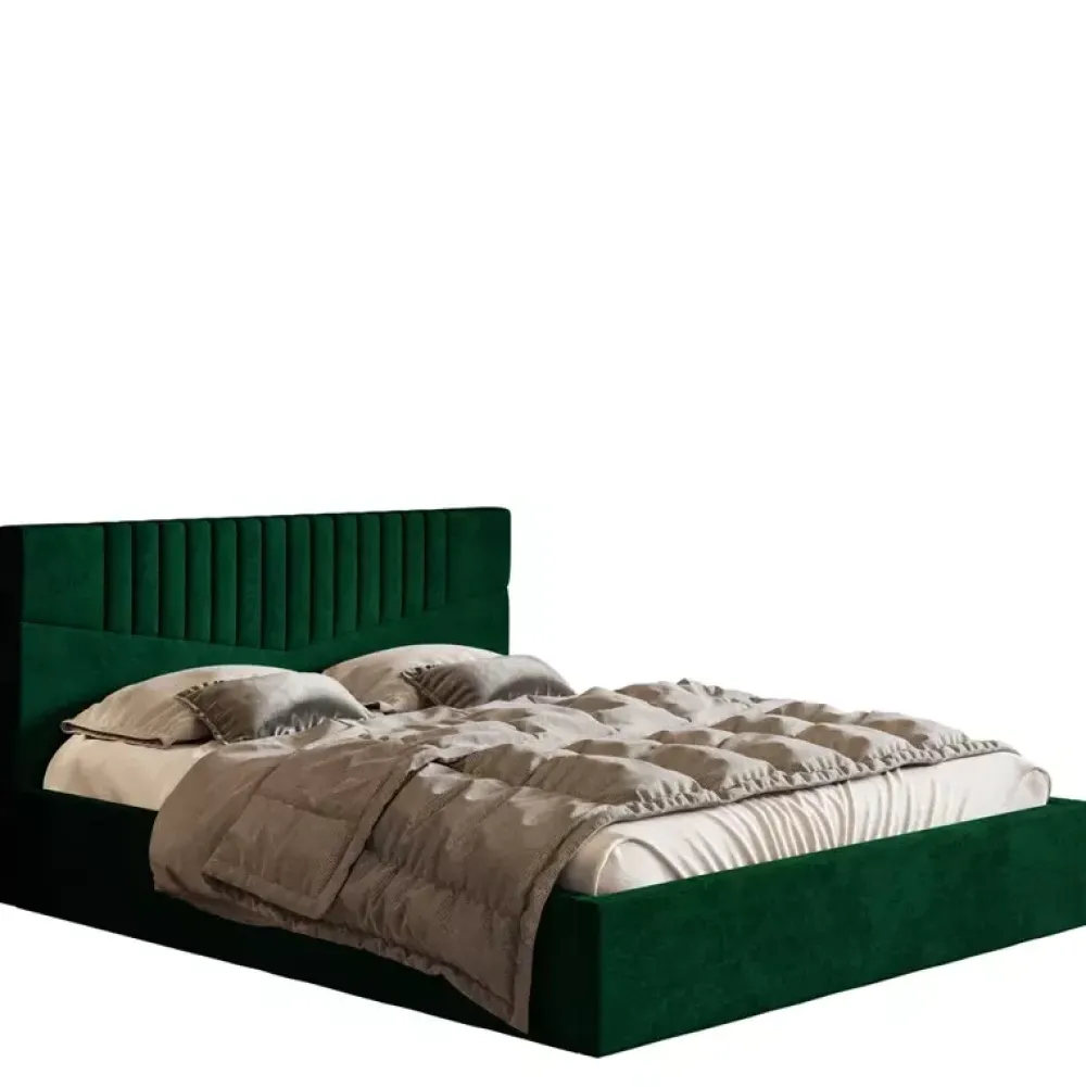 - Łóżko z prostym zagłówkiem udekorowanym prostym wzorem. Konfigurator oferuje wiele opcji personalizacji, między innymi wybór tkaniny, opcję zmiany stelaża z drewnianego na metalowy, czy obicie pleców oparcia w tkaninie identycznej jak całe łóżko.