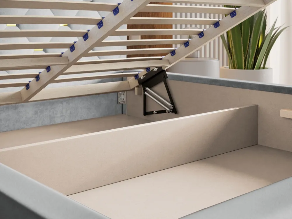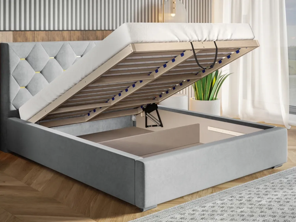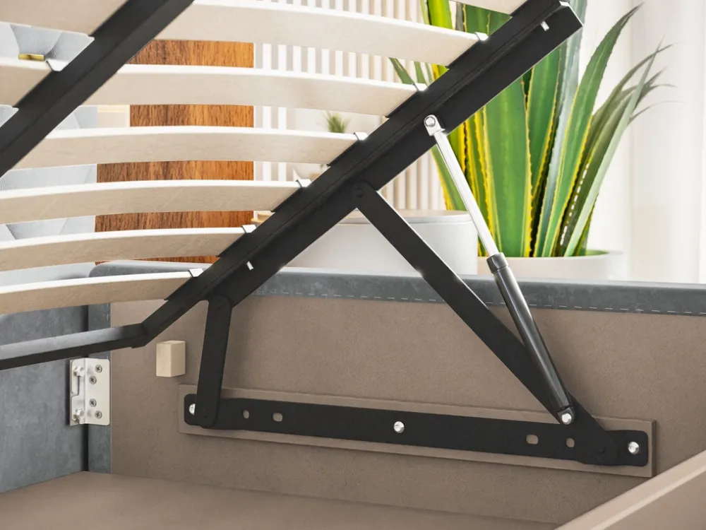 - Opcjonalnie stelaż drewniany za dopłata zmienić można na wersję z ramą wykonaną z metalu, podnoszoną na siłownikach gazowych. W tej wersji stelaż składa się z 36 brzozowych listew sprężynujących. Uchwyt służący do podnoszenia stelaża w kolorze losowym, element niewidoczny. Obciążenie maksymalne to 200 kg.